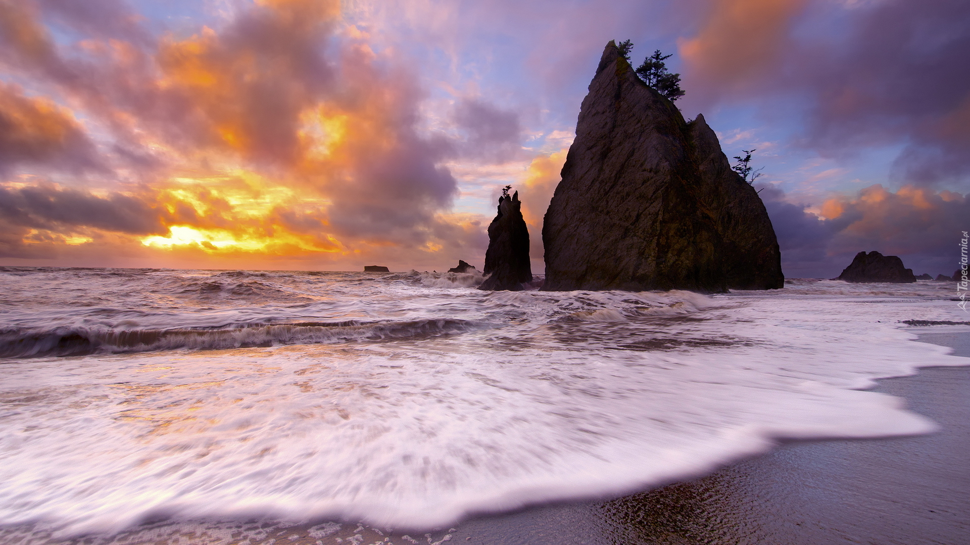 Edytor tapety: Skały na brzegu morza o zachodzie słońca