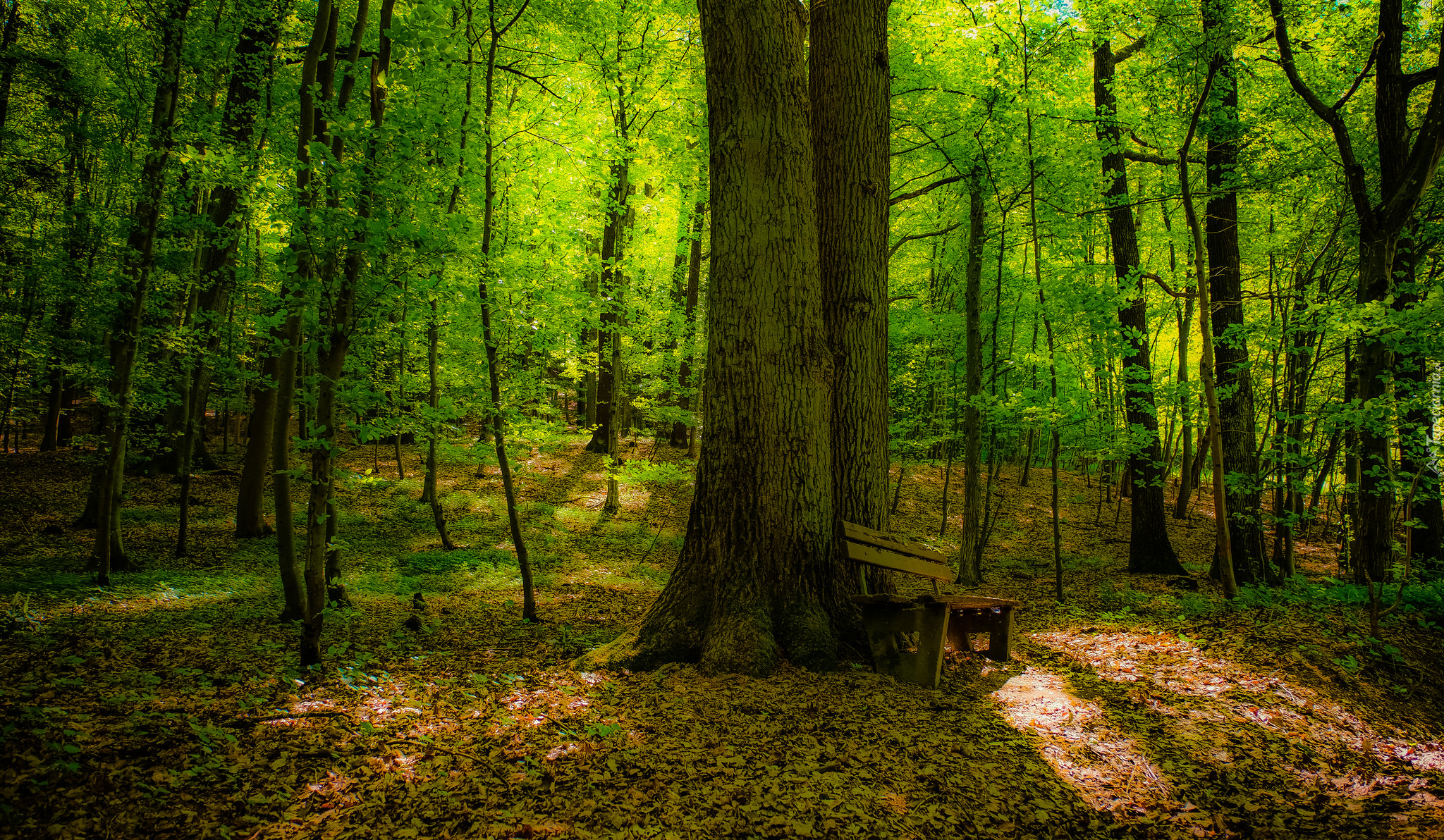 Edytor tapety: Drewniana ławka pod drzewem w lesie