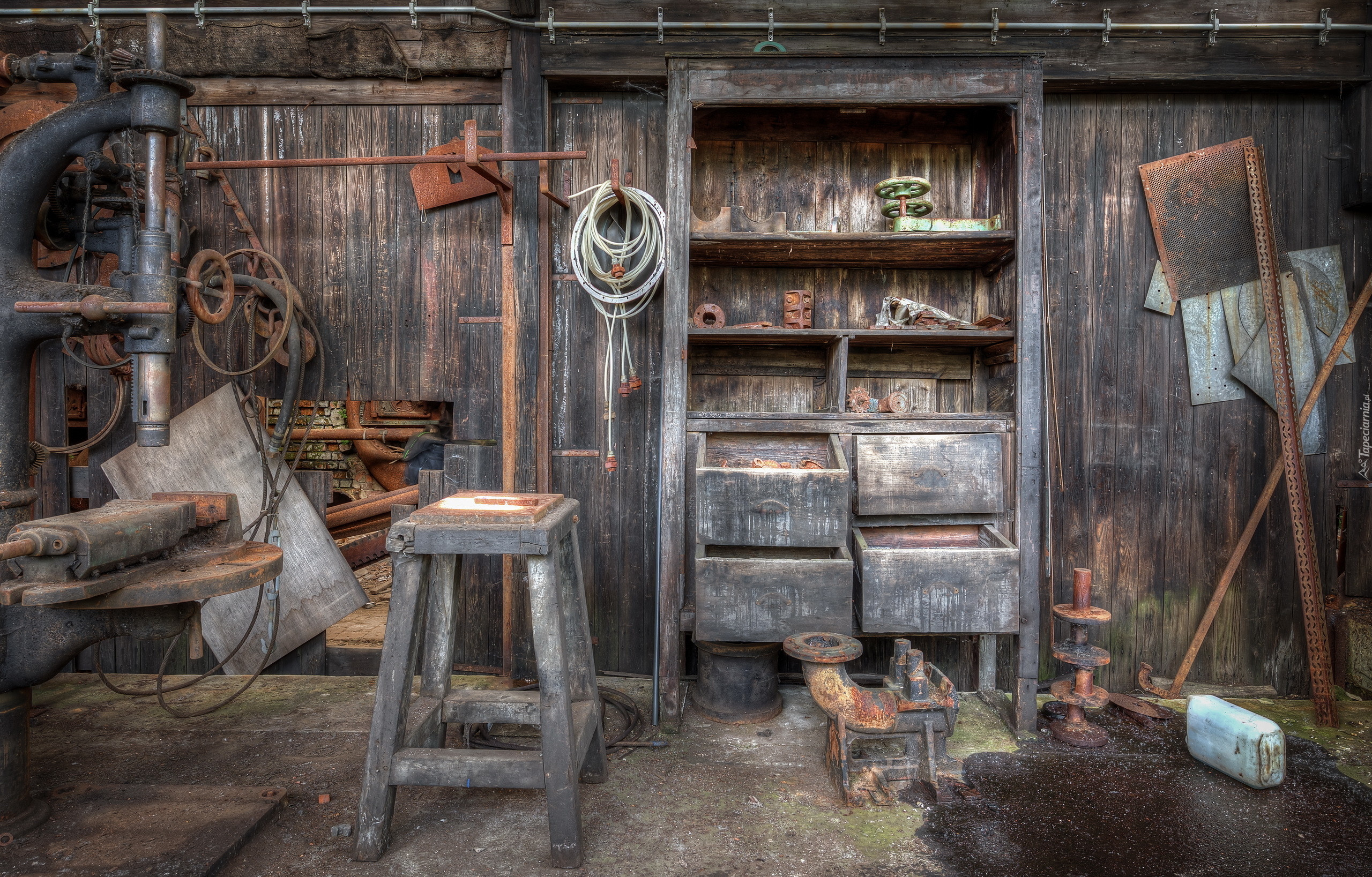 Edytor tapety: Zardzewiałe narzędzia i maszyny w szopie
