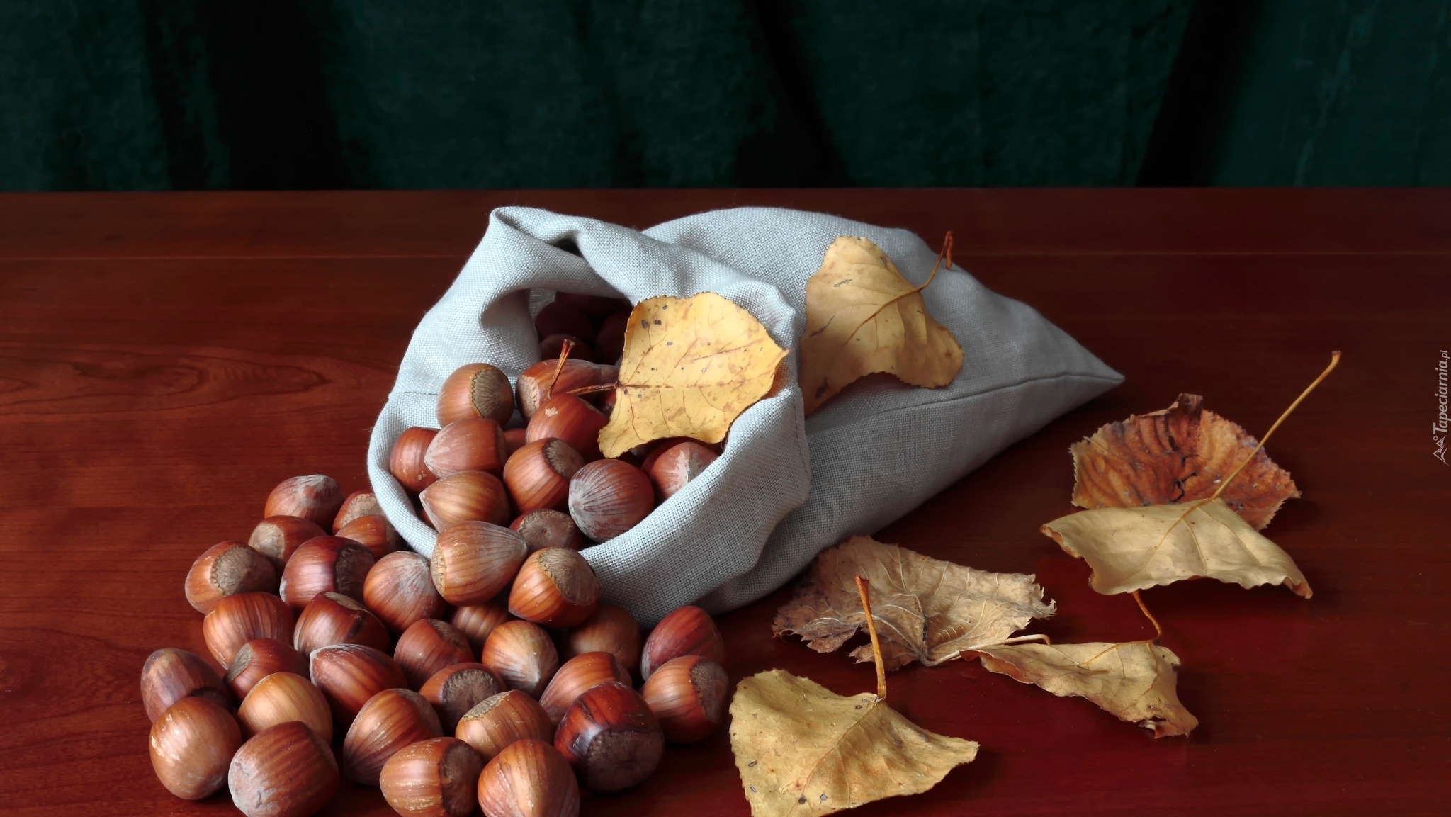 Edytor tapety: Suche liście obok orzechów laskowych wysypanych z worka