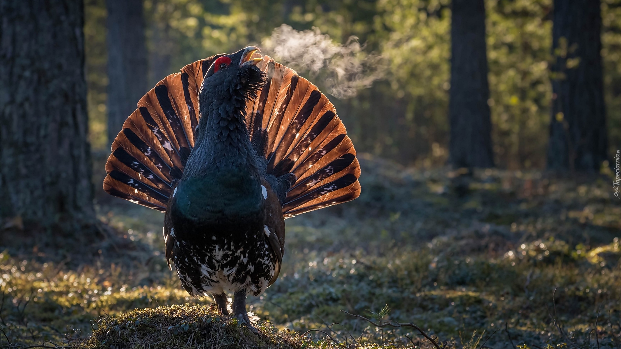 Edytor tapety: Głuszec prezentuje swój ogon na leśnej polanie