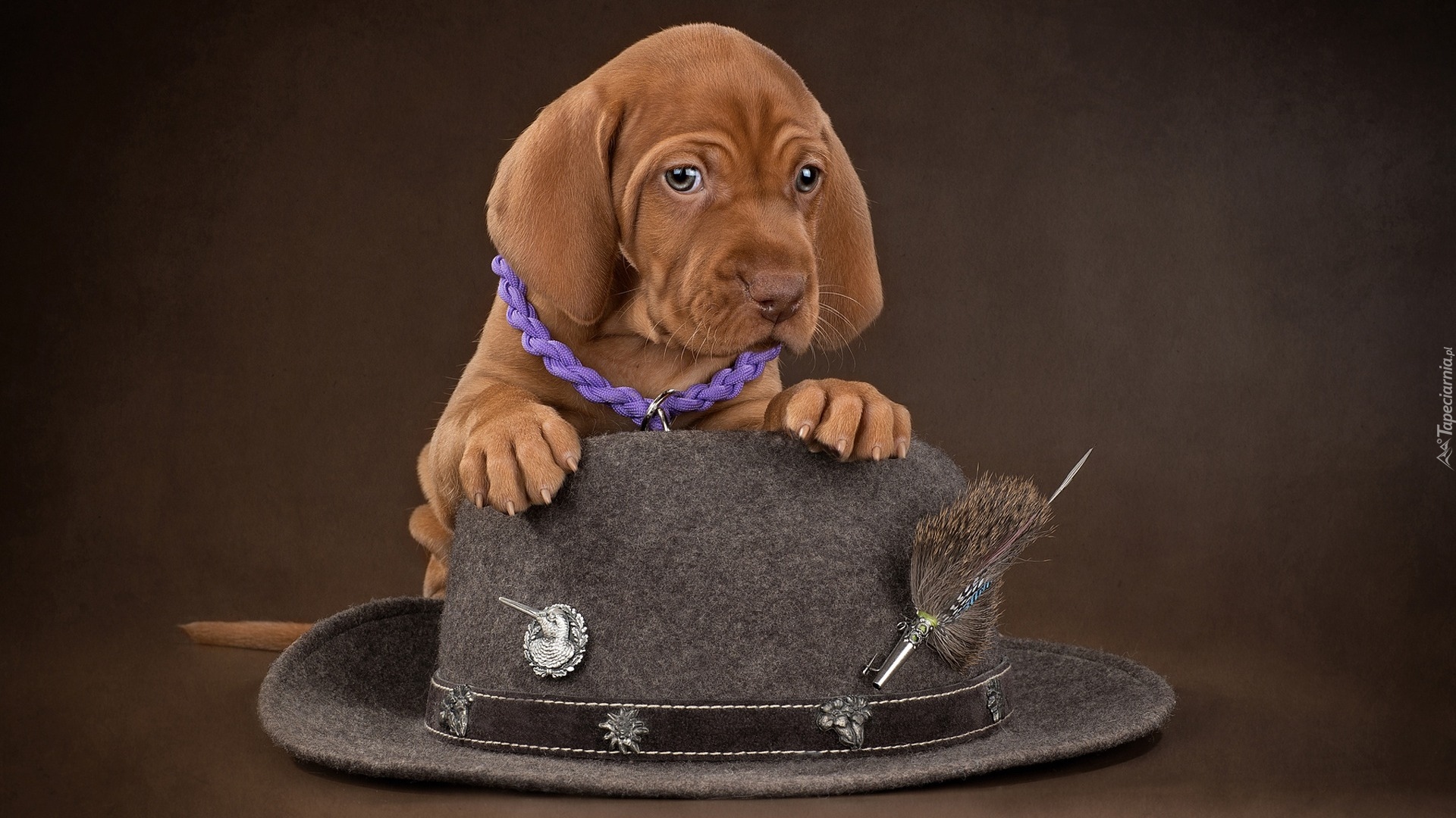 Edytor tapety: Szczeniak wyżła węgierskiego oparty łapkami o kapelusz