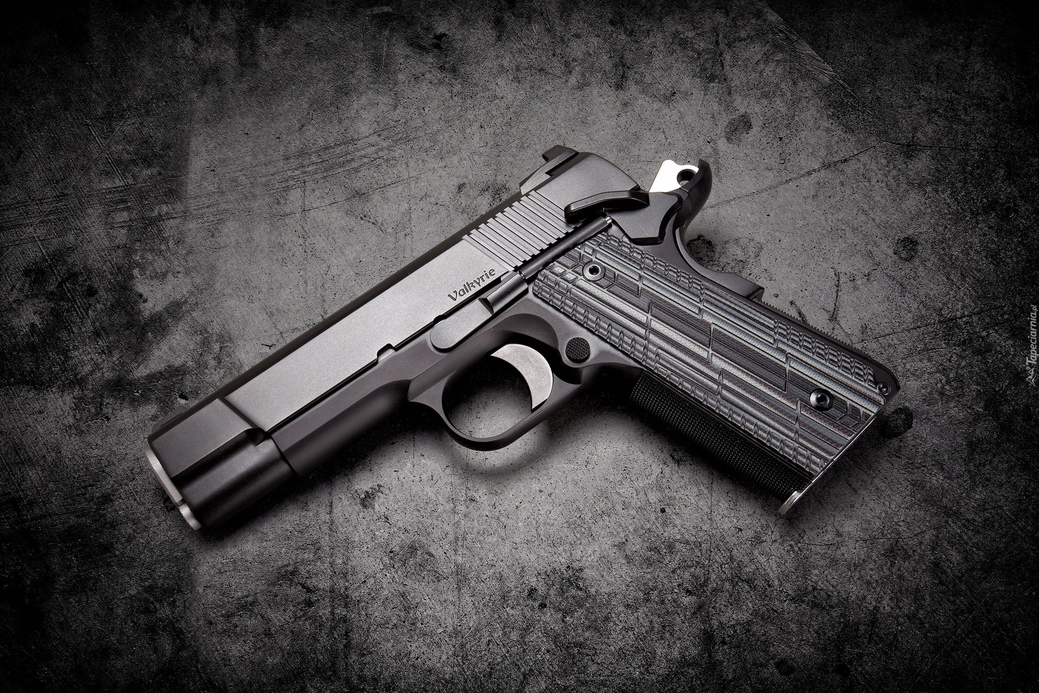 Edytor tapety: Pistolet na czarno-białej fotografii