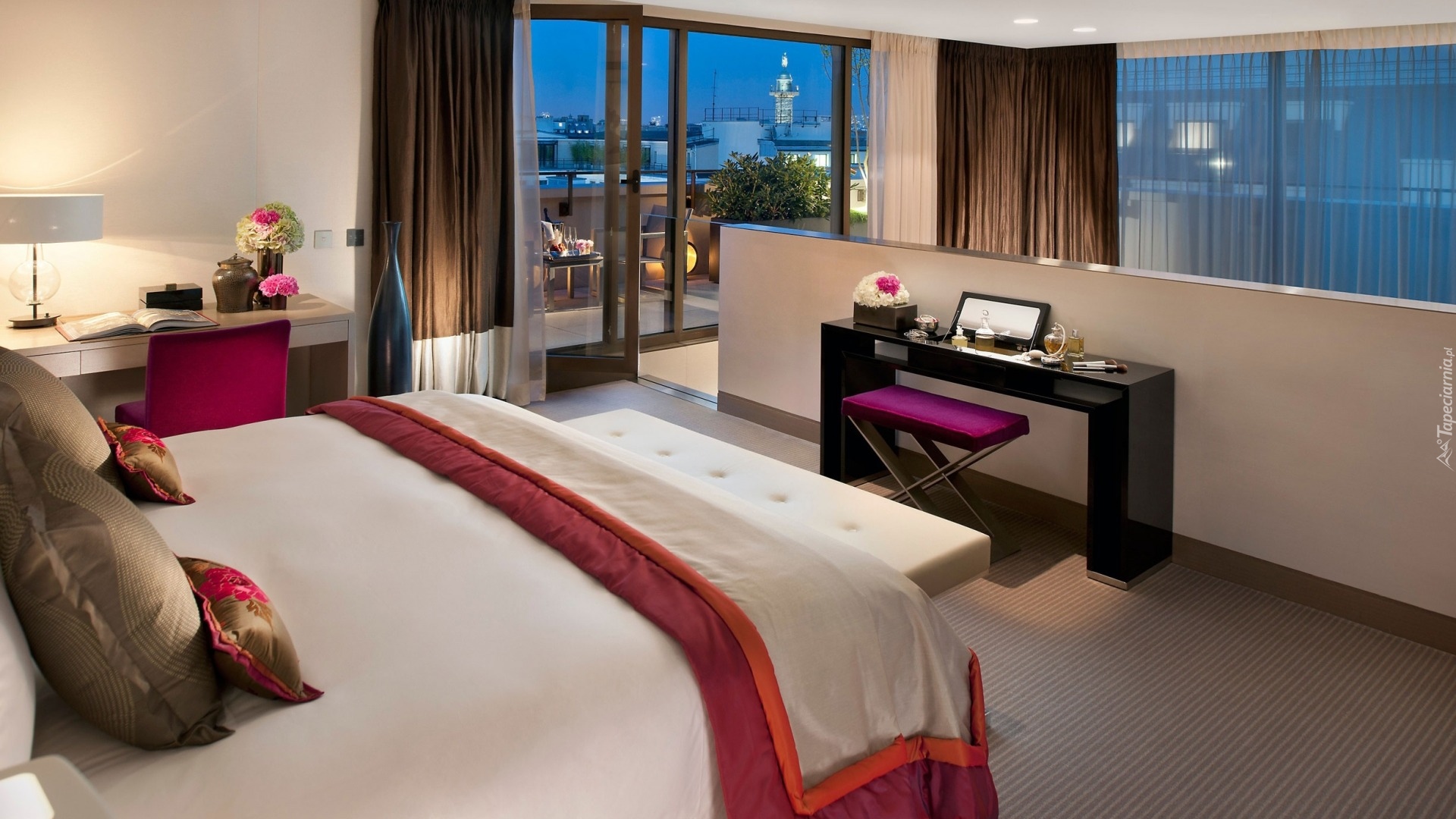 Edytor tapety: Wnętrze umeblowanego pokoju sypialnego z wyjściem na balkon