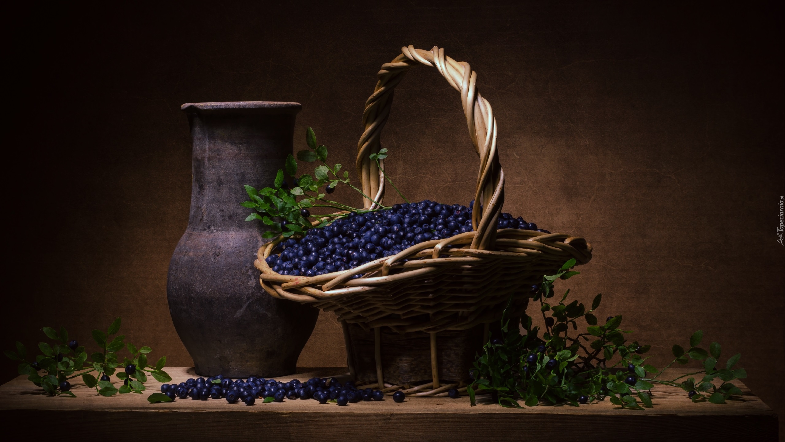 Edytor tapety: Kosz pełen czarnych jagód obok glinianego dzbana