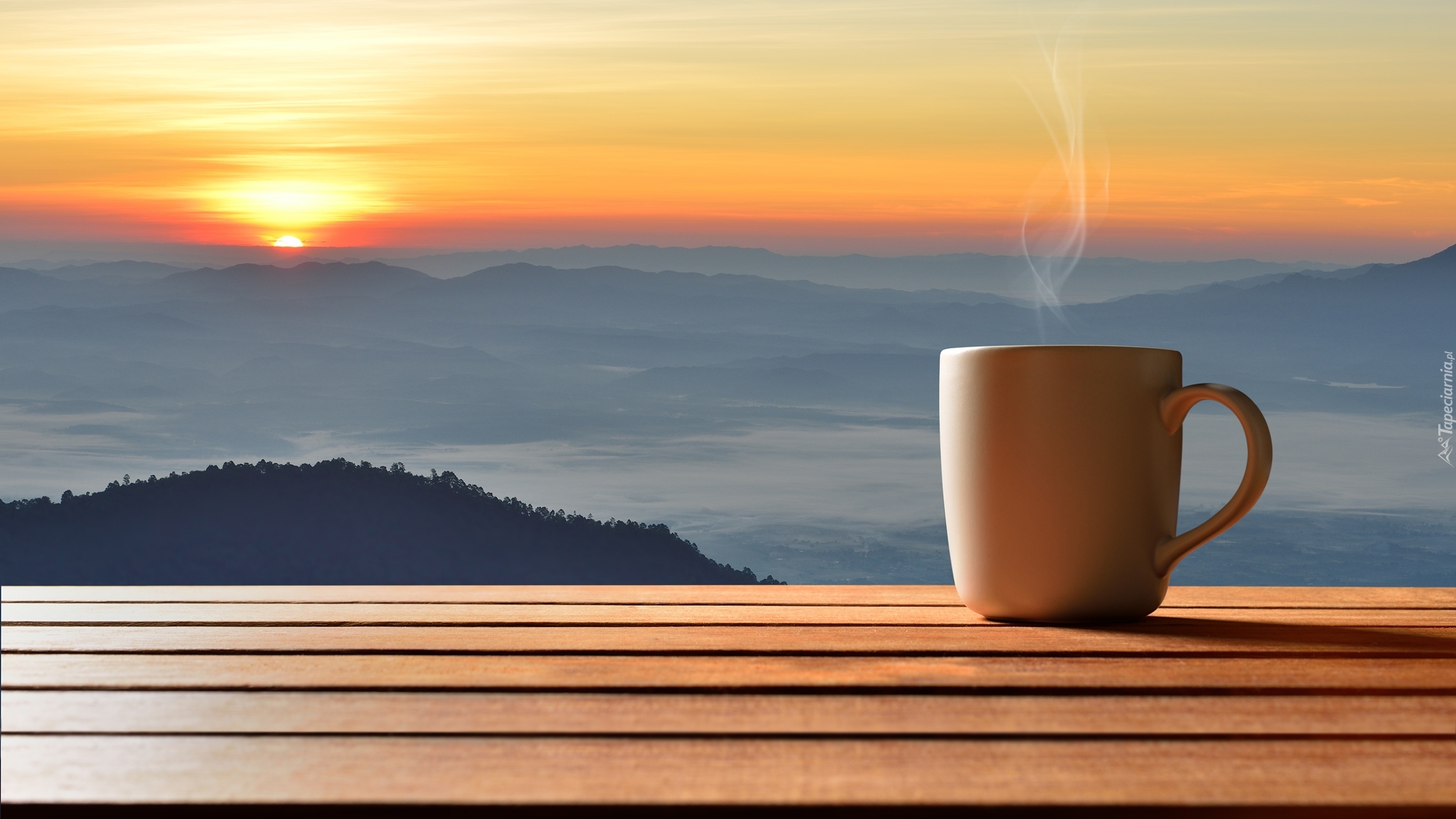 Edytor tapety: Kubek z parującym napojem postawiony na deskach