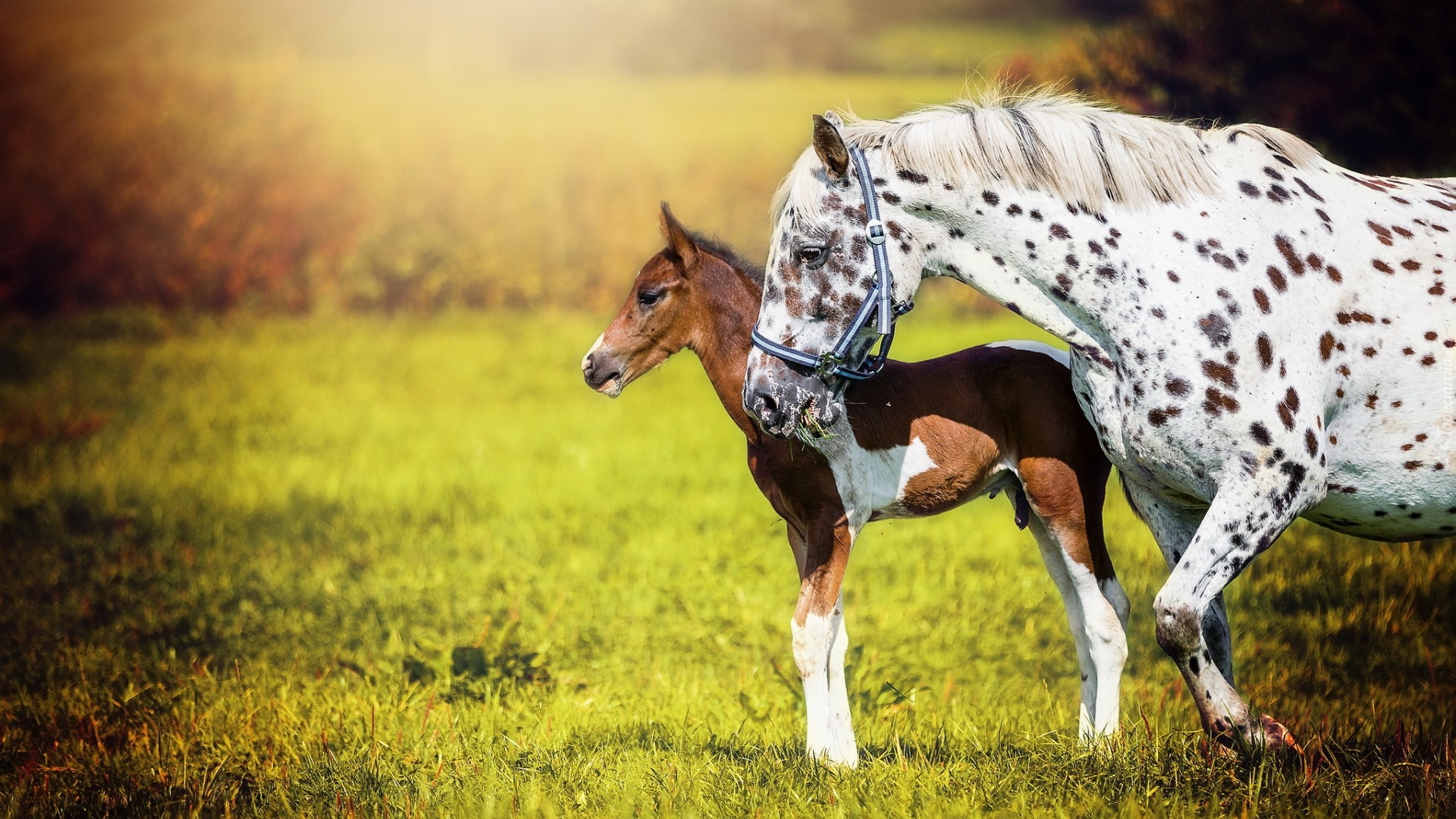 Edytor tapety: Koń maści tarantowatej i źrebię