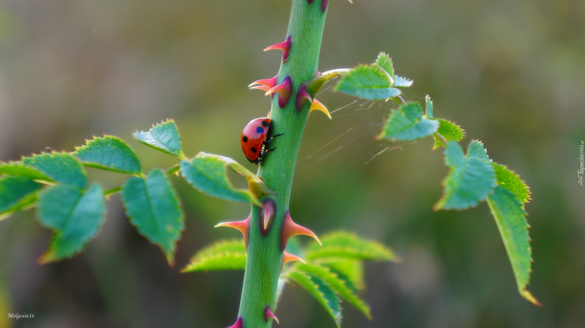 Edytor tapety: Biedronka na kolczastej łodydze róży