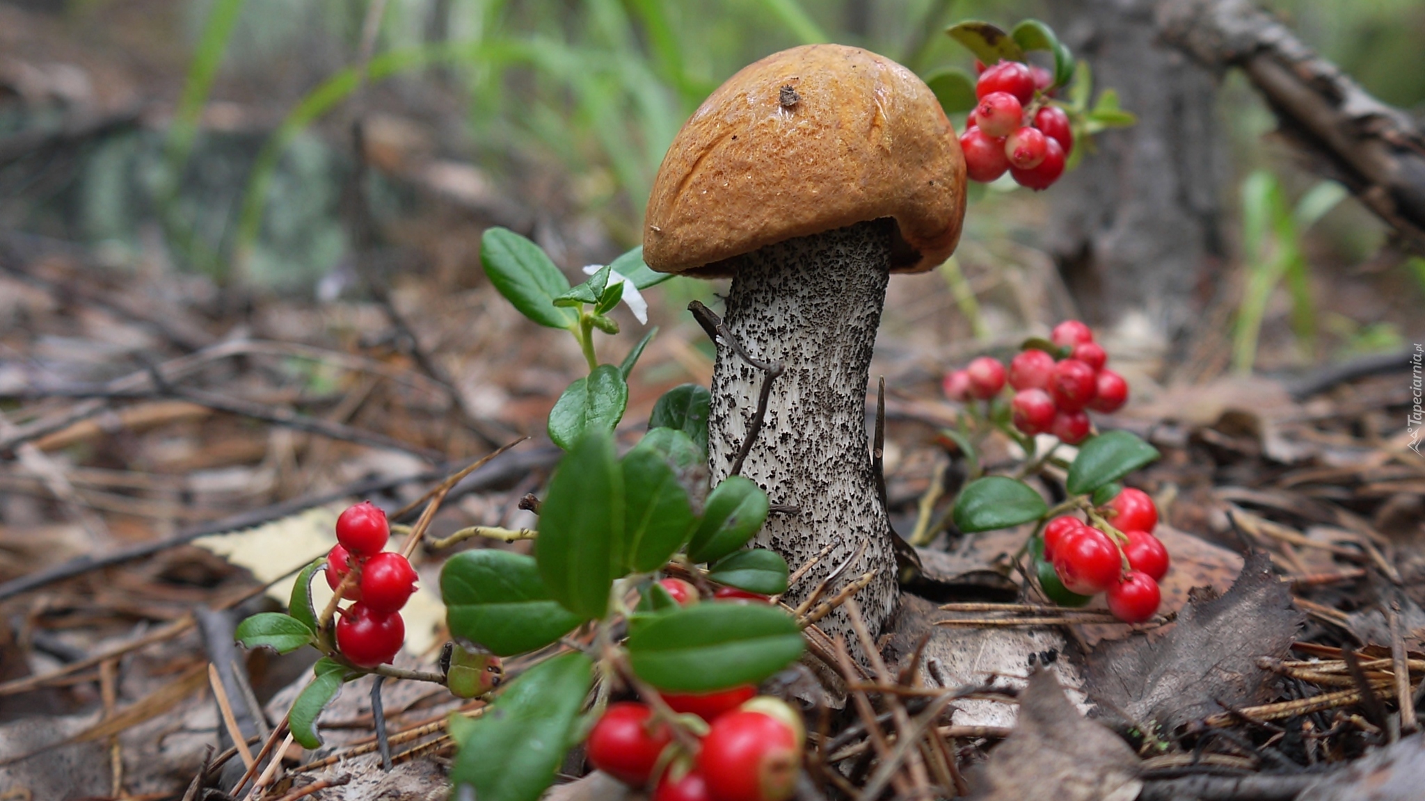 Edytor tapety: Koźlarz obok gałązek z owocami brusznicy
