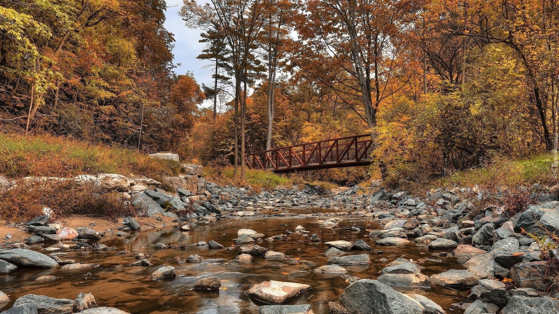 Edytor tapety: Mostek nad kamienistą rzeką w jesiennym lesie