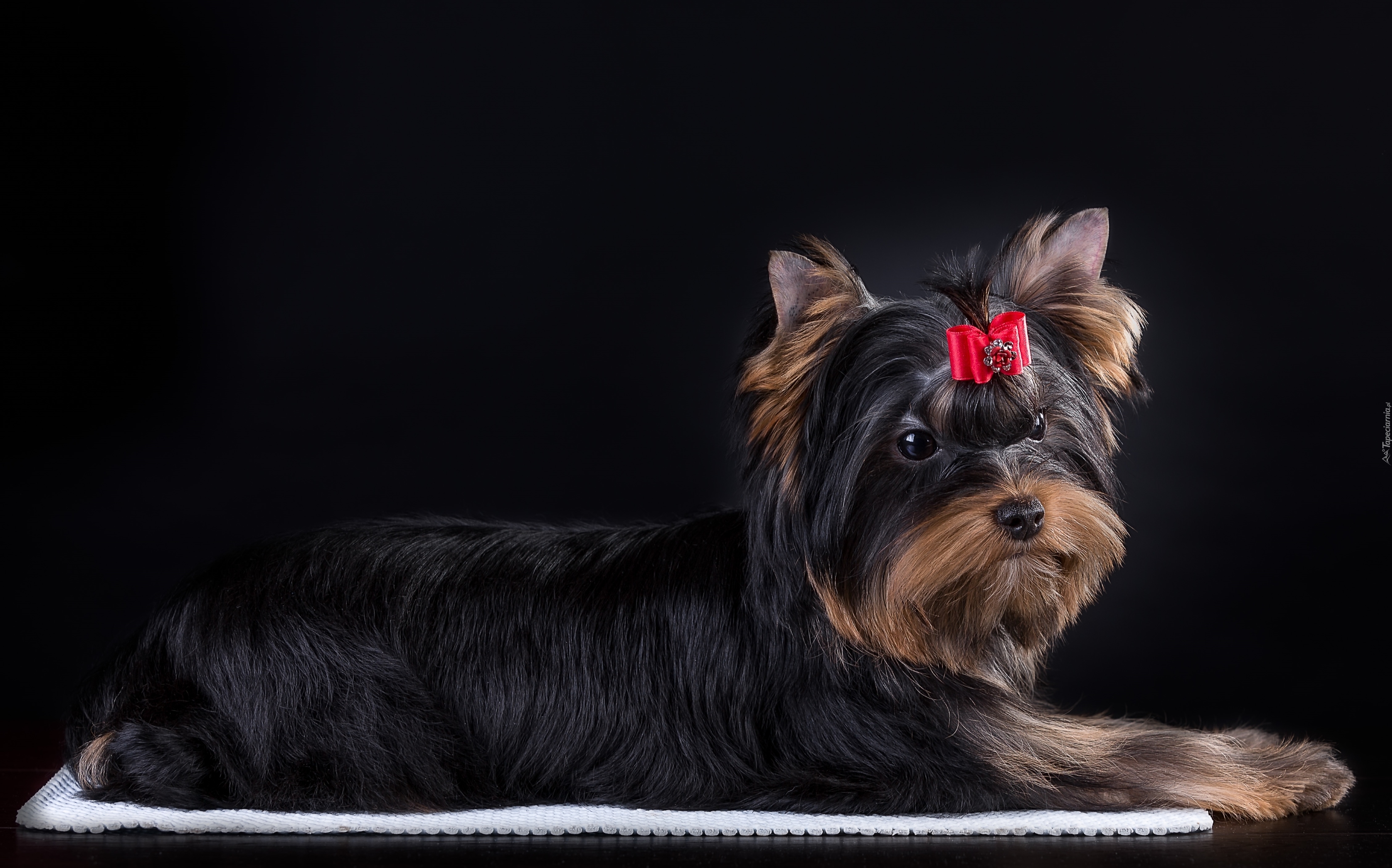 Edytor tapety: Yorkshire terrier z czerwoną kokardką