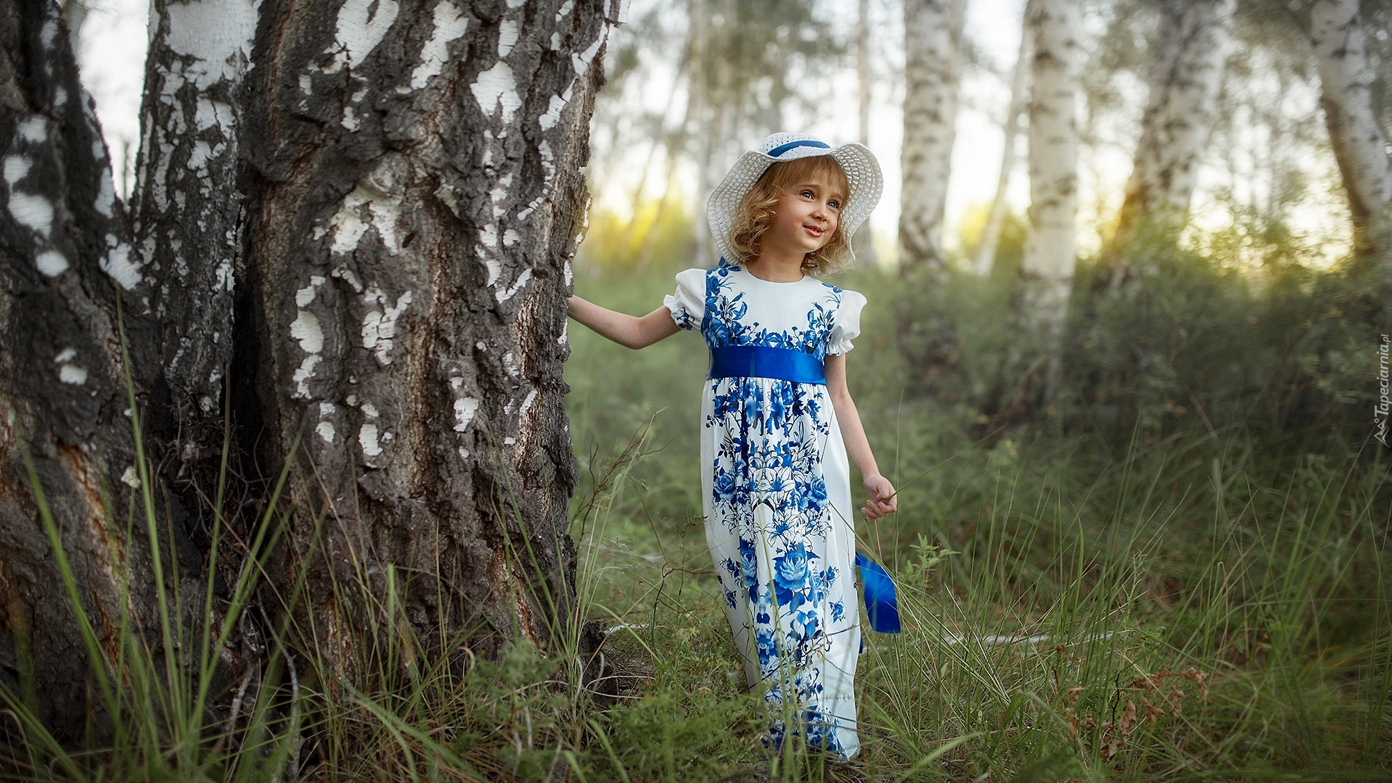 Edytor tapety: Dziewczynka w kapeluszu oparta o pień brzozy