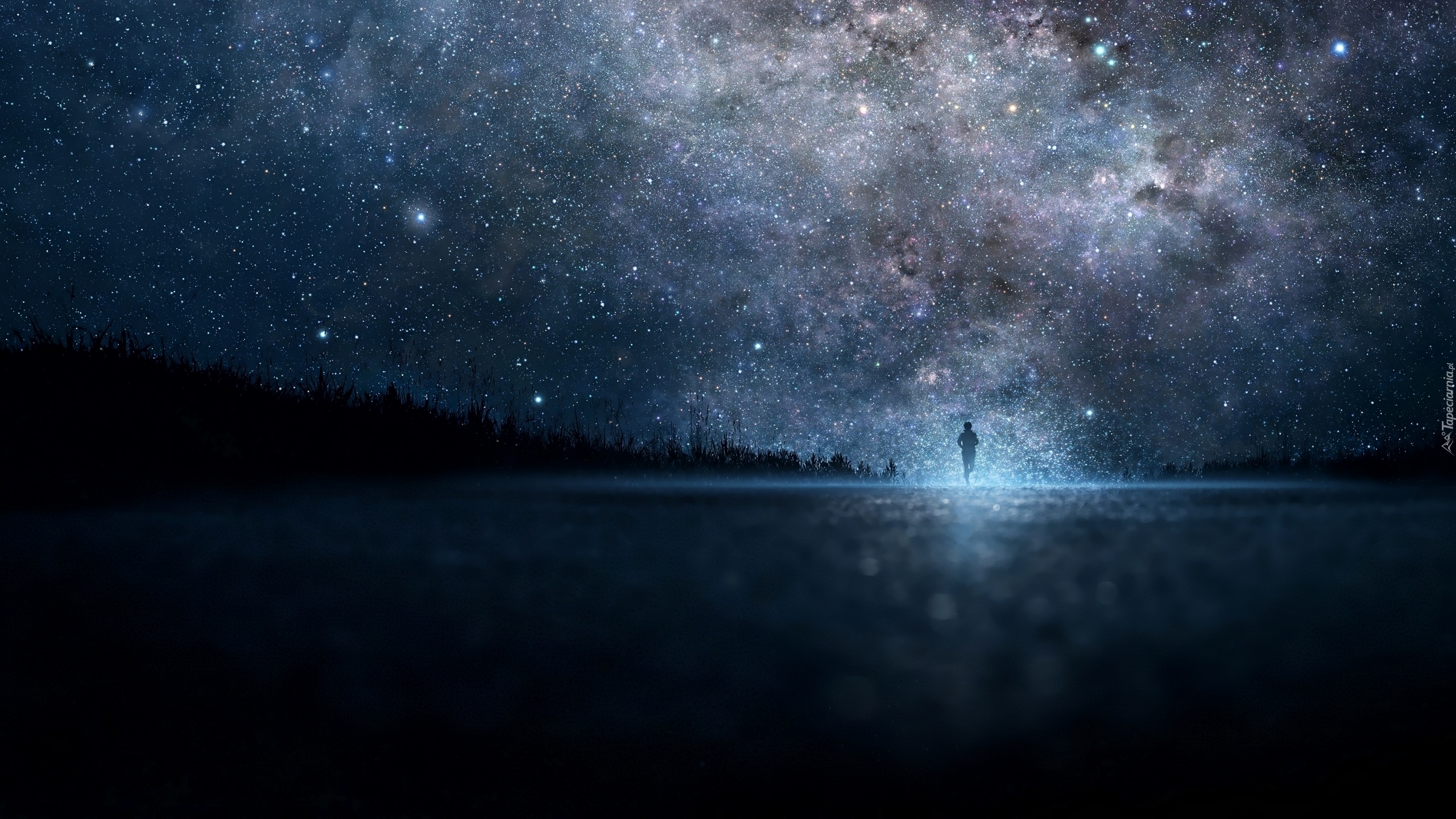 Edytor tapety: Biegnący człowiek na tle gwieździstego nieba nocą
