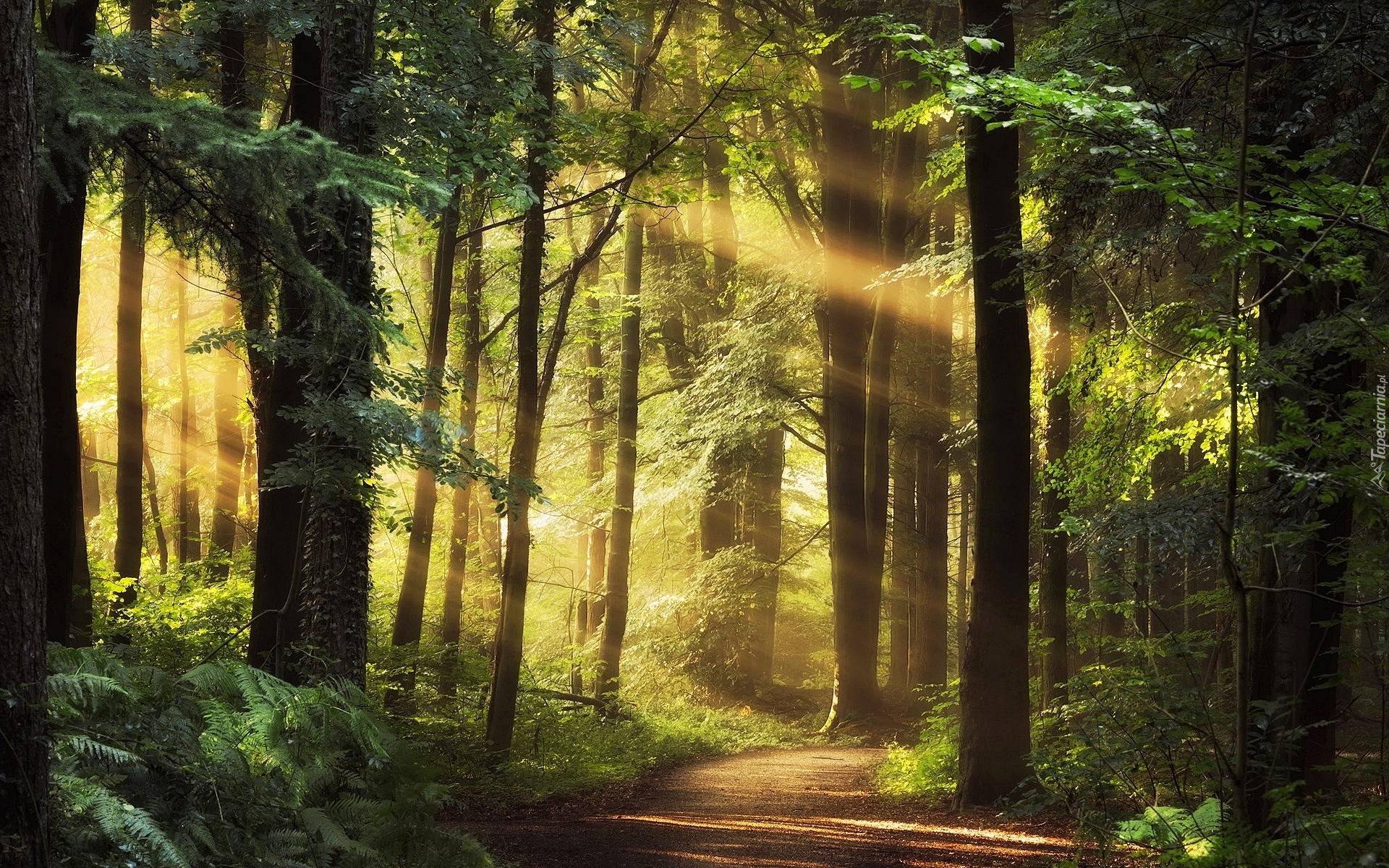 Edytor tapety: Słoneczne światło wpadające do lasu
