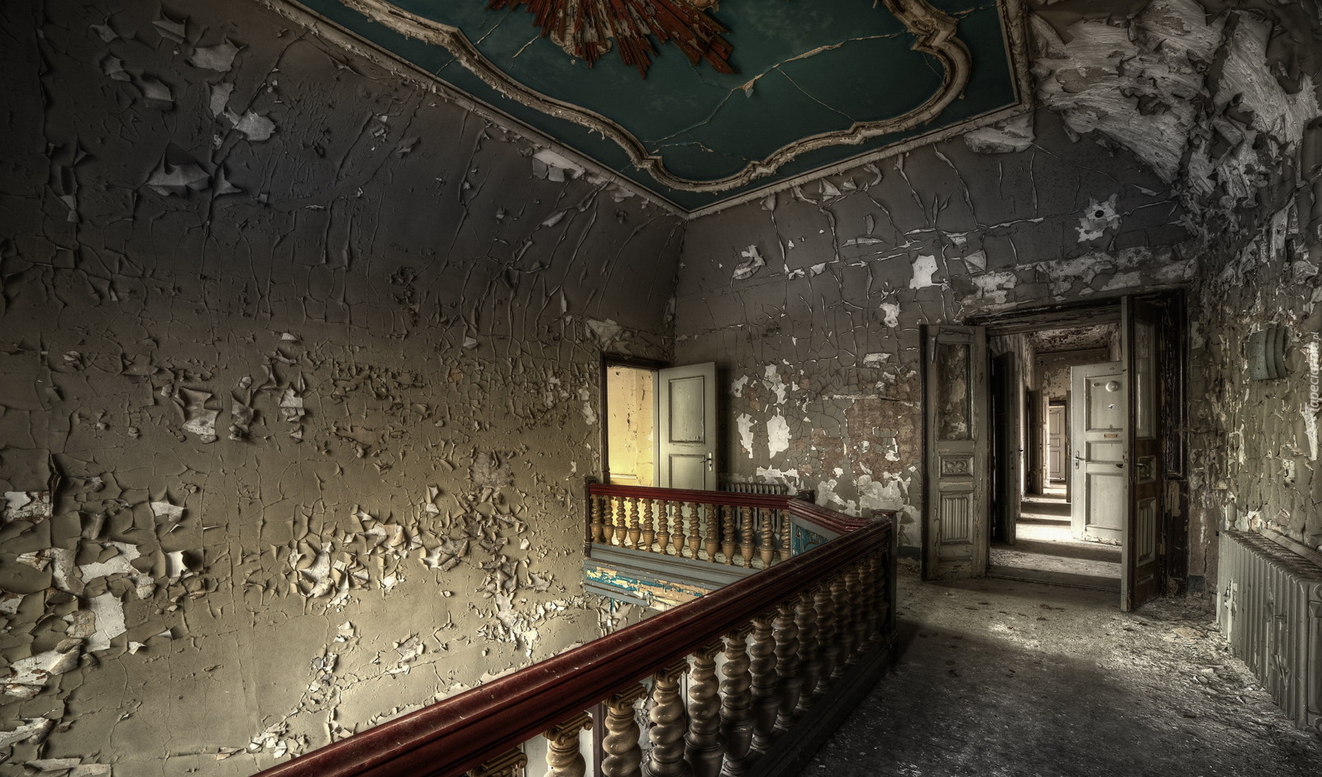 Edytor tapety: Zaniedbany korytarz z barierką i otwartymi drzwiami