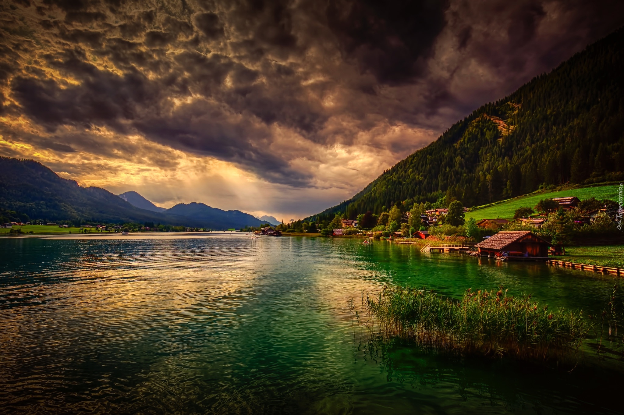 Edytor tapety: Chmury nad górami i jeziorem w Austrii