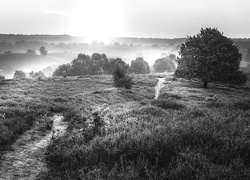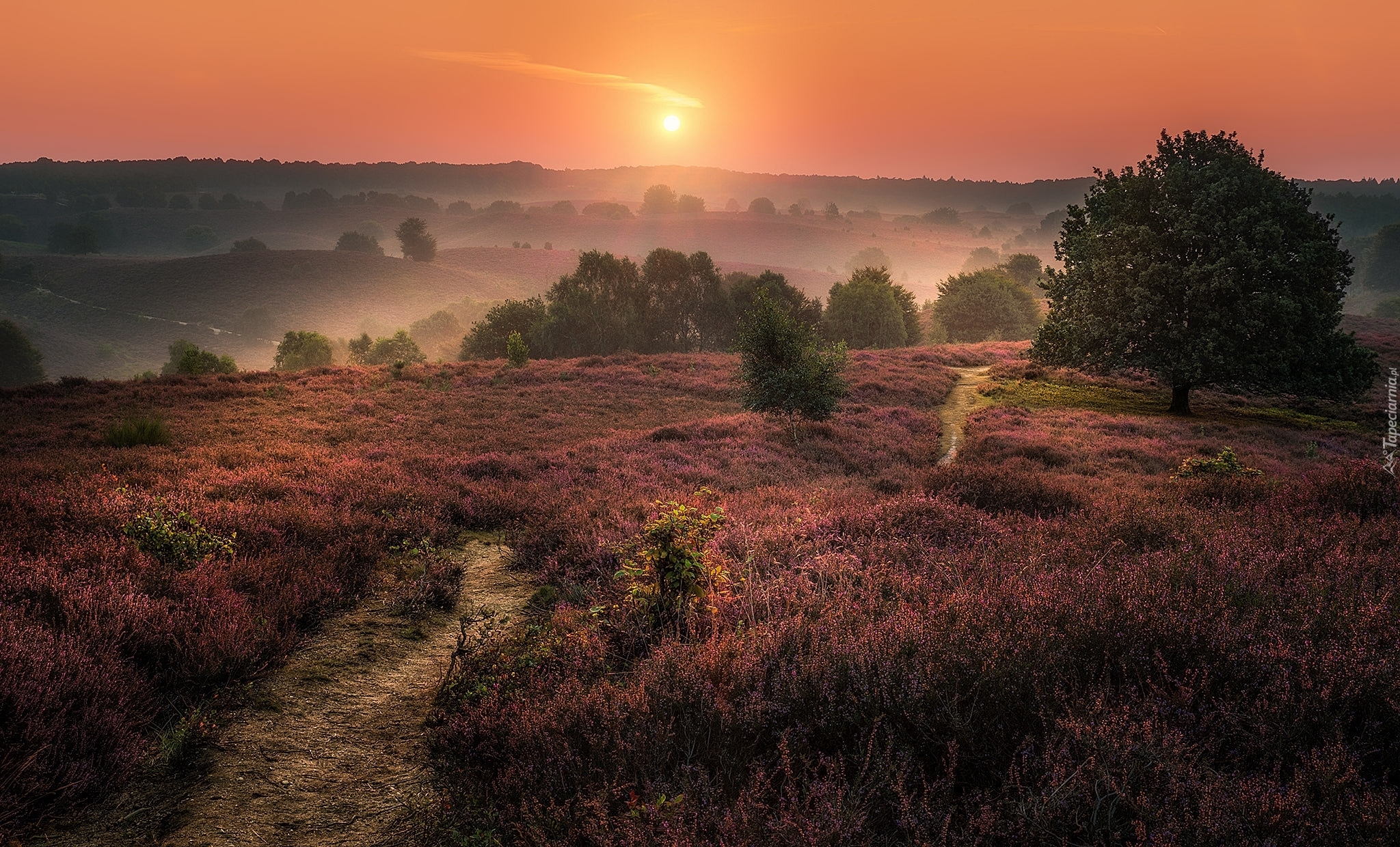Edytor tapety: Mgła nad wrzosowiskiem o wschodzie słońca