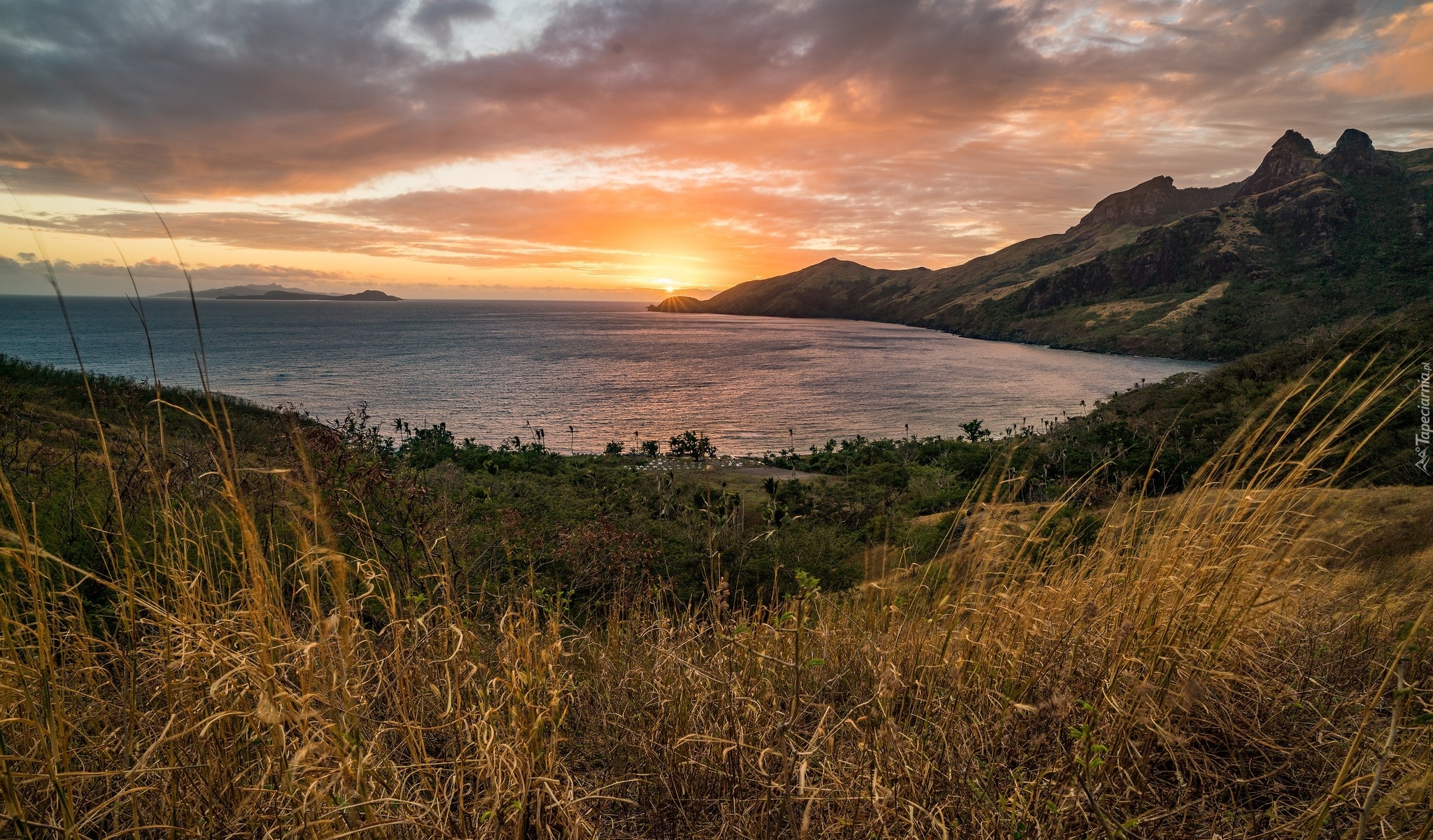 Edytor tapety: Wzgórza nad morzem w promieniach zachodzącego słońca