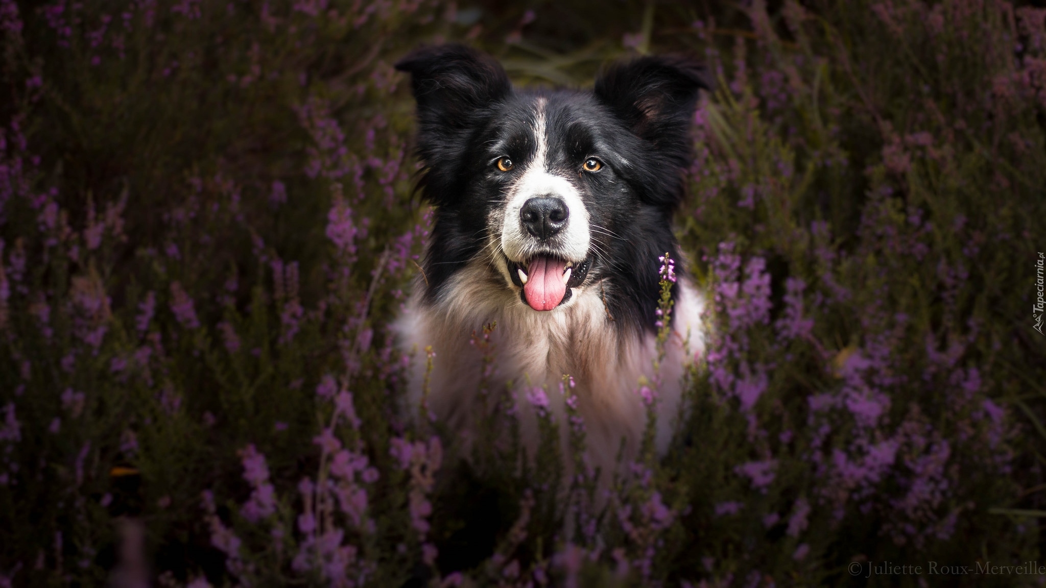 Edytor tapety: Radosny border collie po uszy we wrzosach