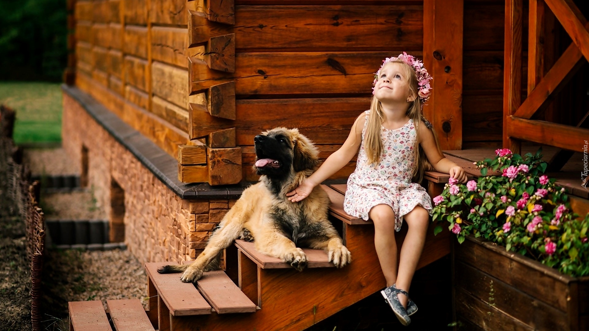 Edytor tapety: Dziewczynka i szczeniak leonbergera siedzą na schodach