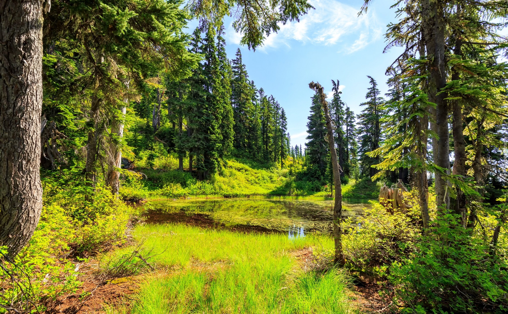 Edytor tapety: Słoneczny dzień nad stawem w lesie