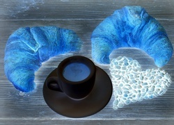 Edytor tapety: Kawa w filiżance obok rogalików i serca ułożonego z ziaren kawy