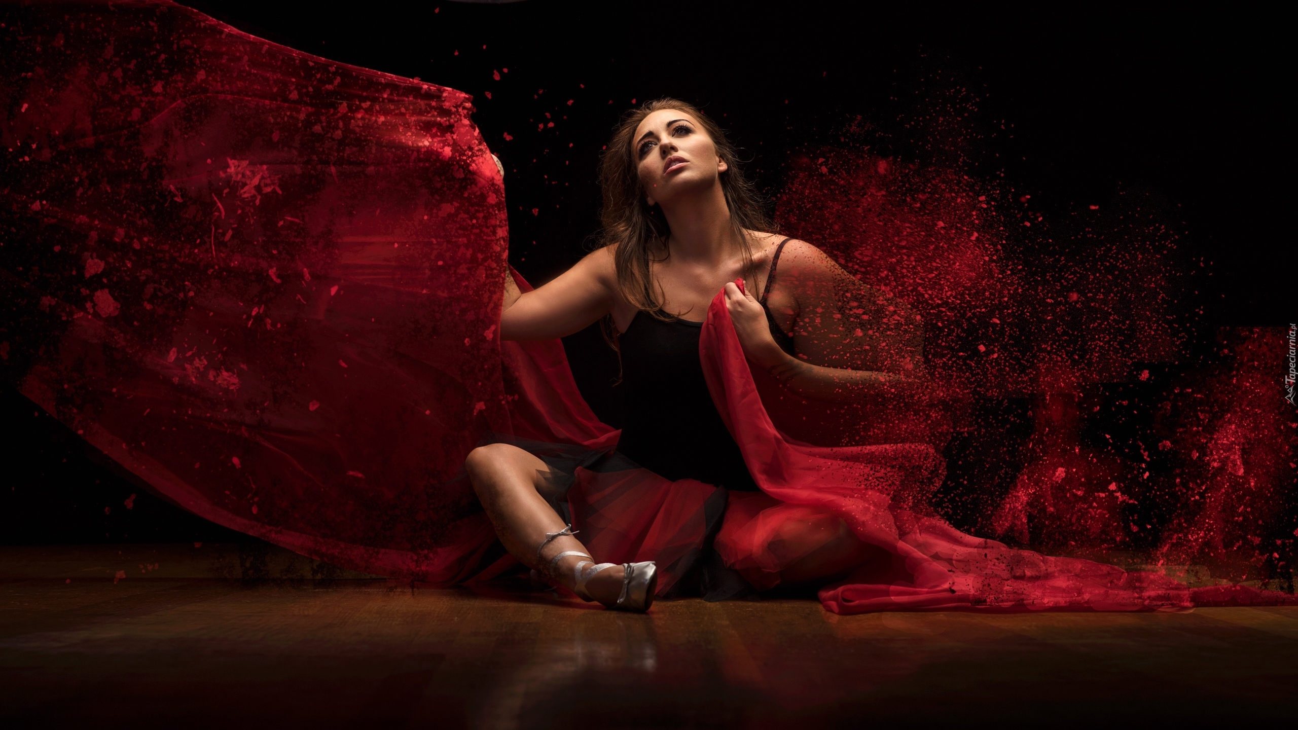 Edytor tapety: Baletnica o smutnym spojrzeniu w czerwonej sukni