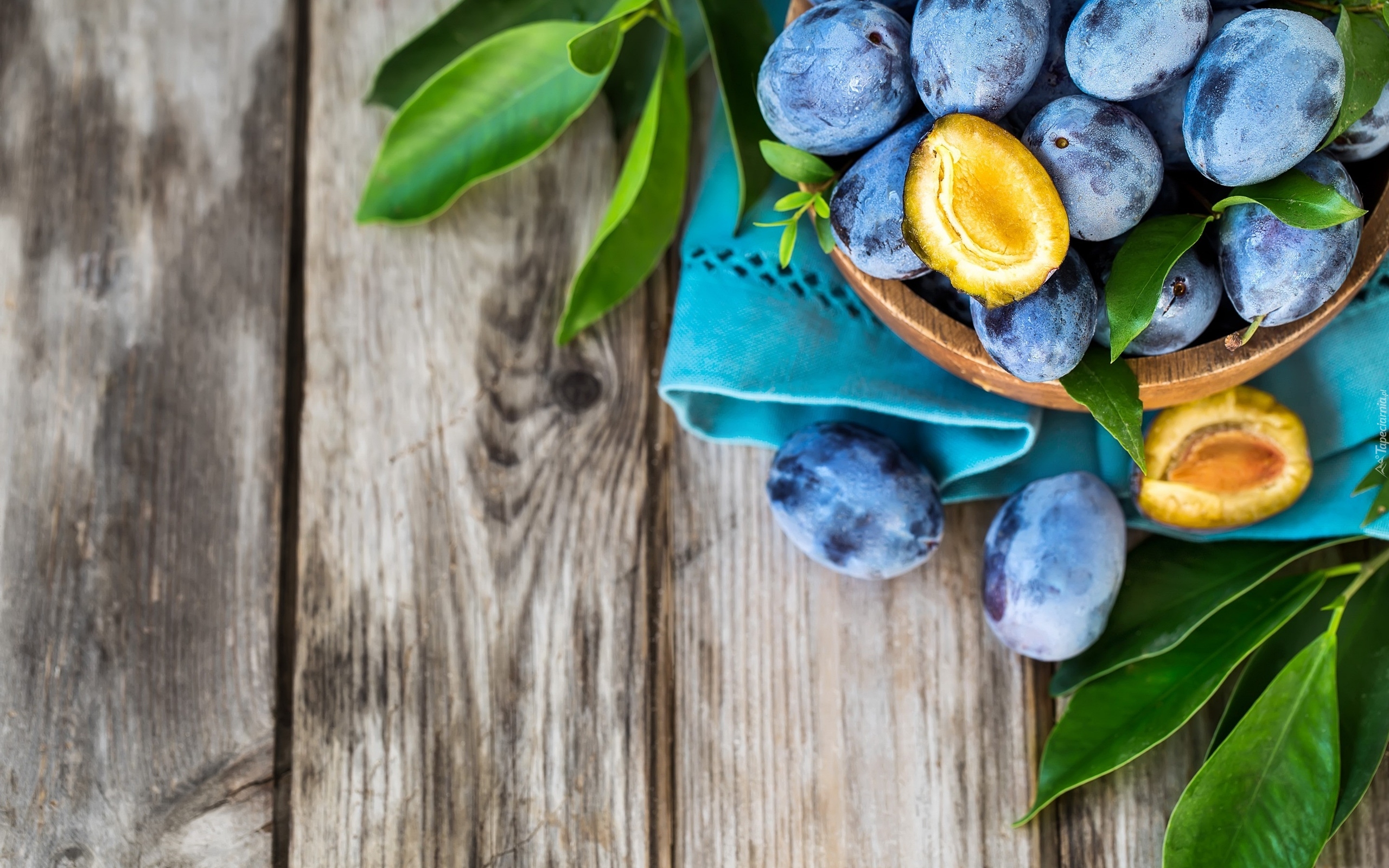 Edytor tapety: Śliwki w misce ustawionej na serwecie