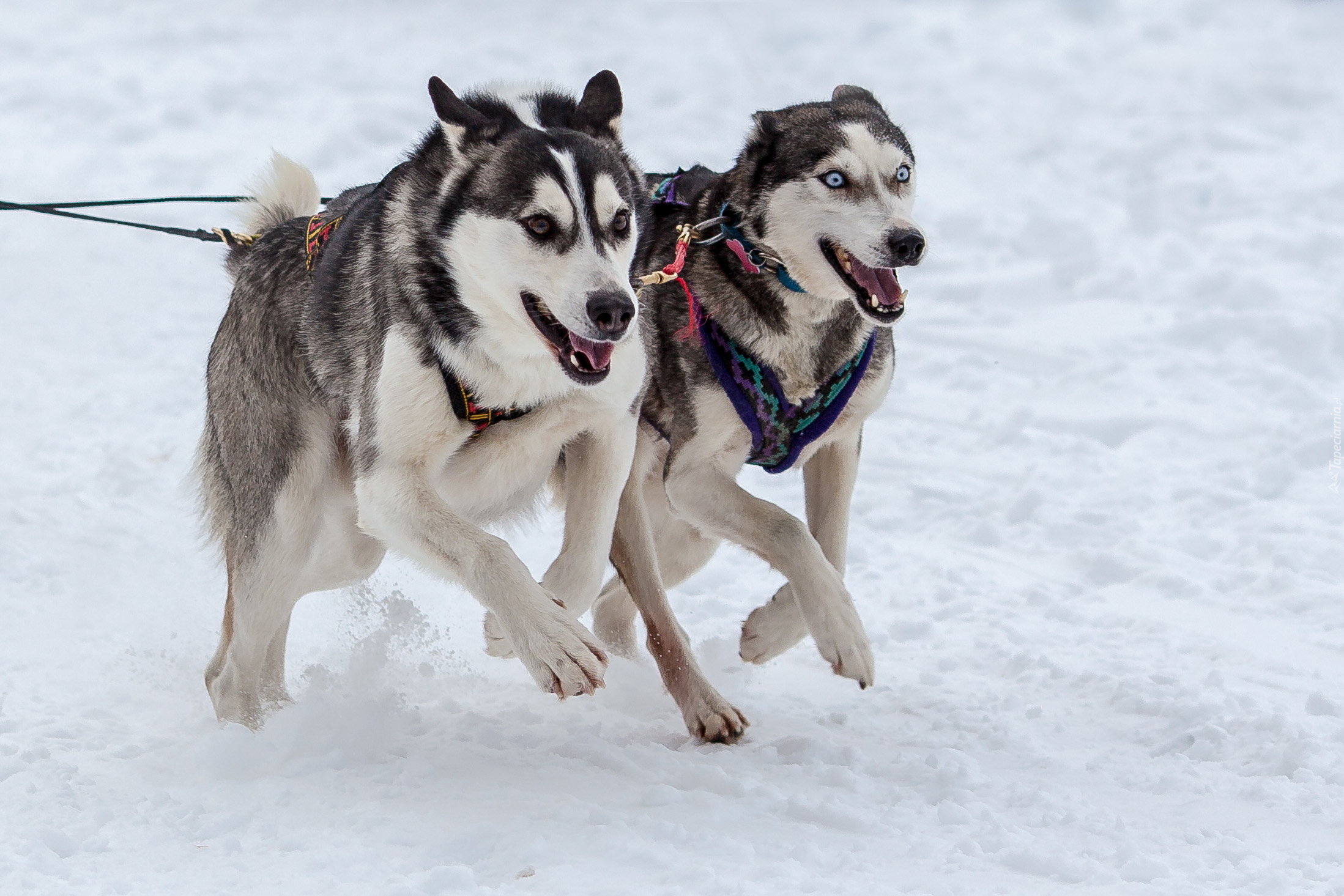 Edytor tapety: Alaskan malamute i siberian husky w zaprzęgu