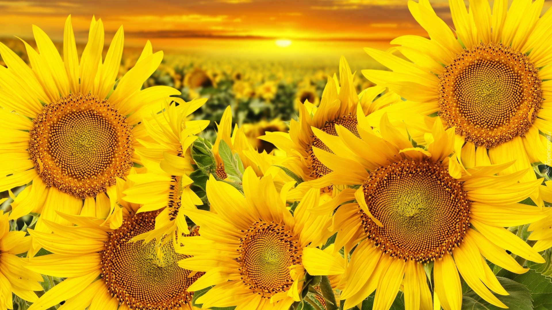 Edytor tapety: Słoneczniki na tle zachodzącego słońca