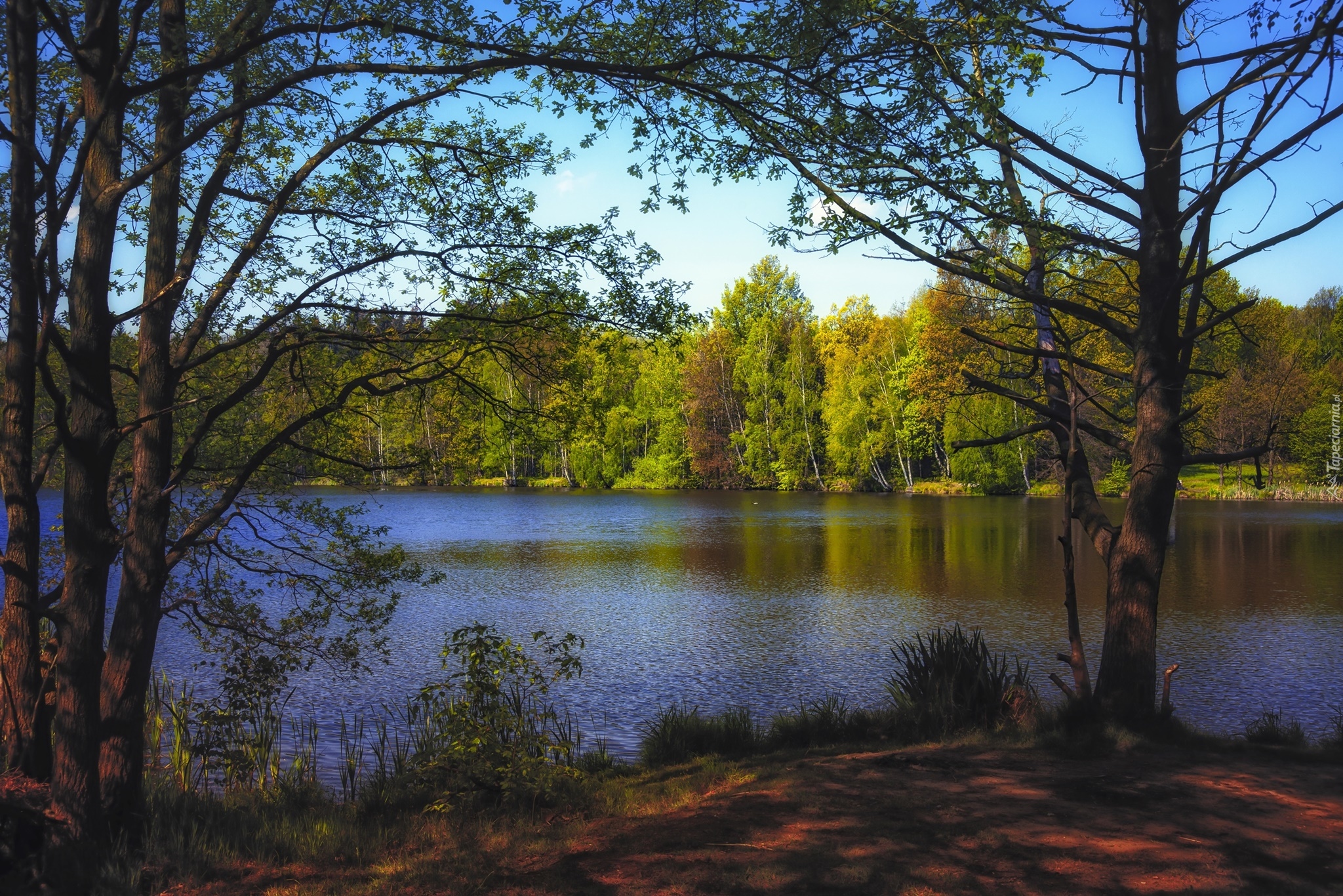 Edytor tapety: Jesienne drzewa nad leśnym jeziorem