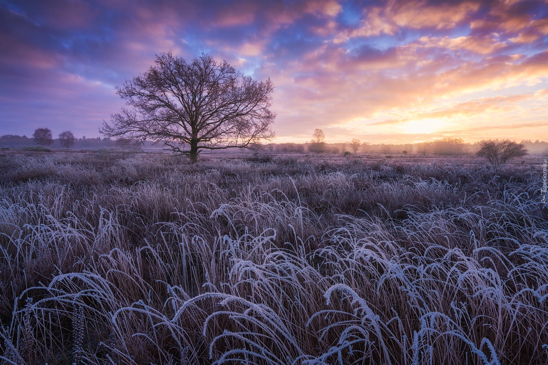 Edytor tapety: Drzewo pośród oszronionych traw