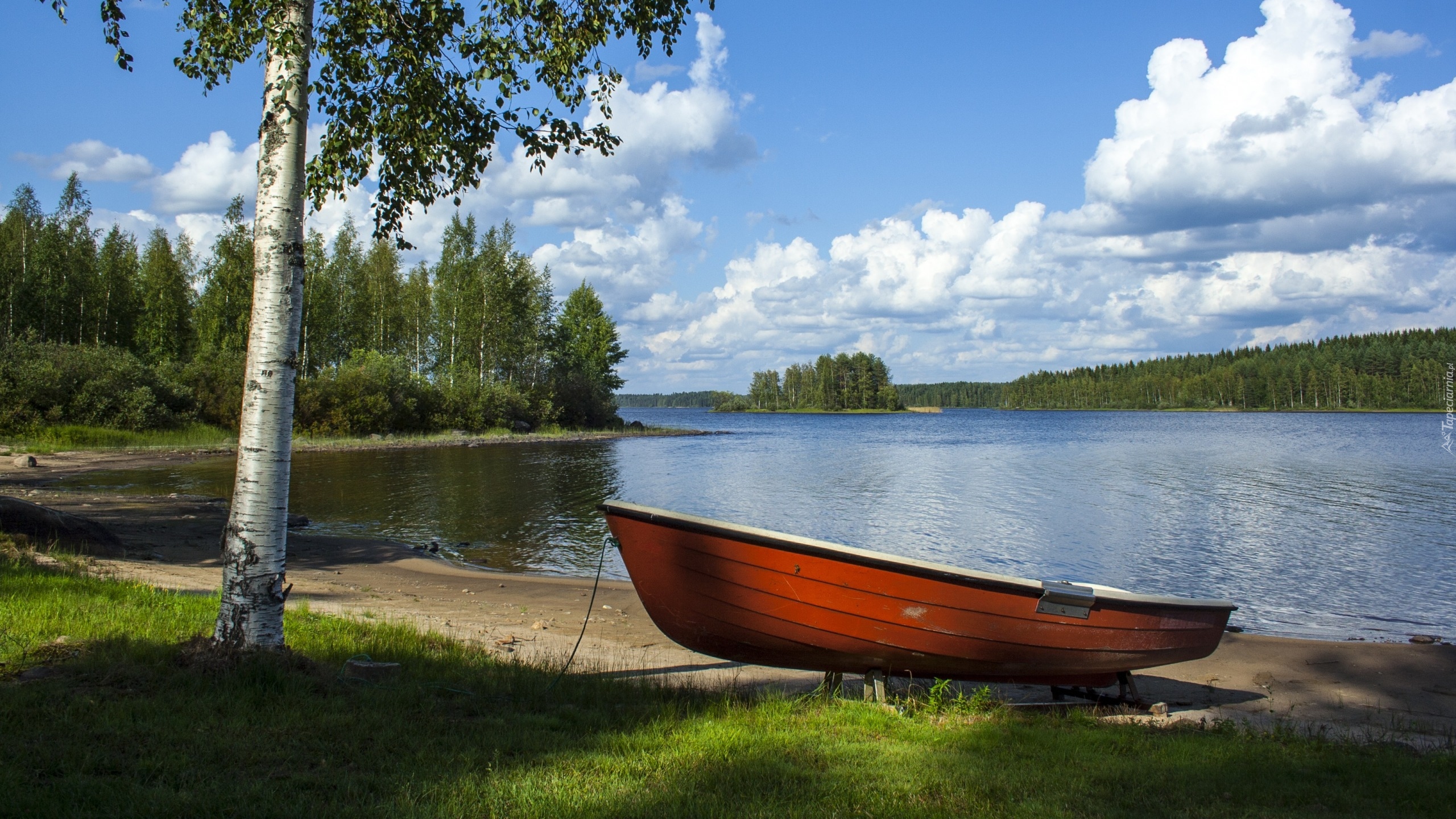 Edytor tapety: Łódka obok brzozy na brzegu jeziora