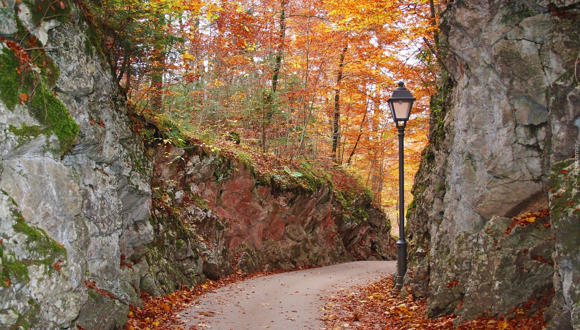 Edytor tapety: Latarnia przy drodze wśród skał jesienią