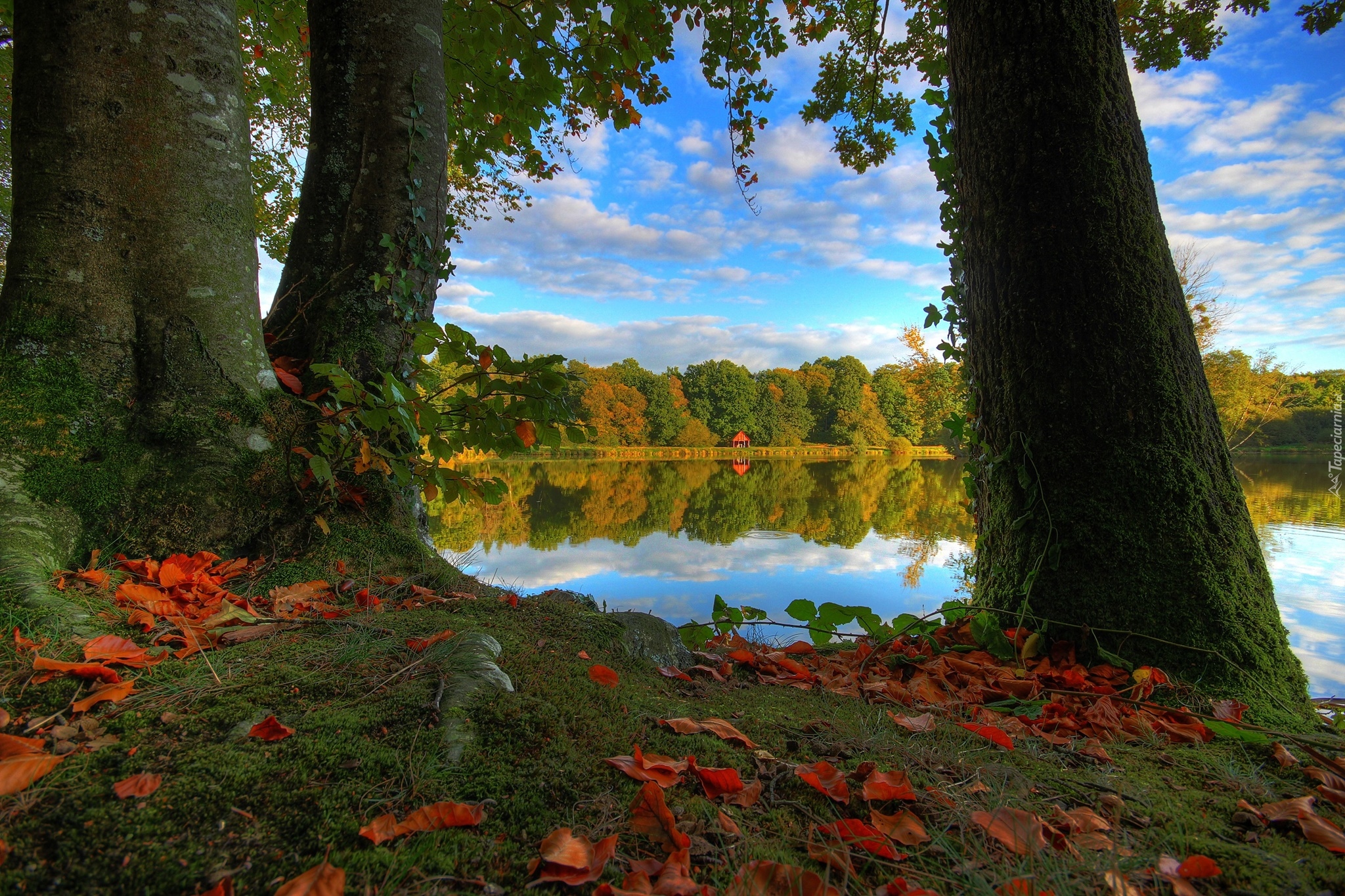 Edytor tapety: Widok na altankę między drzewami nad jeziorem