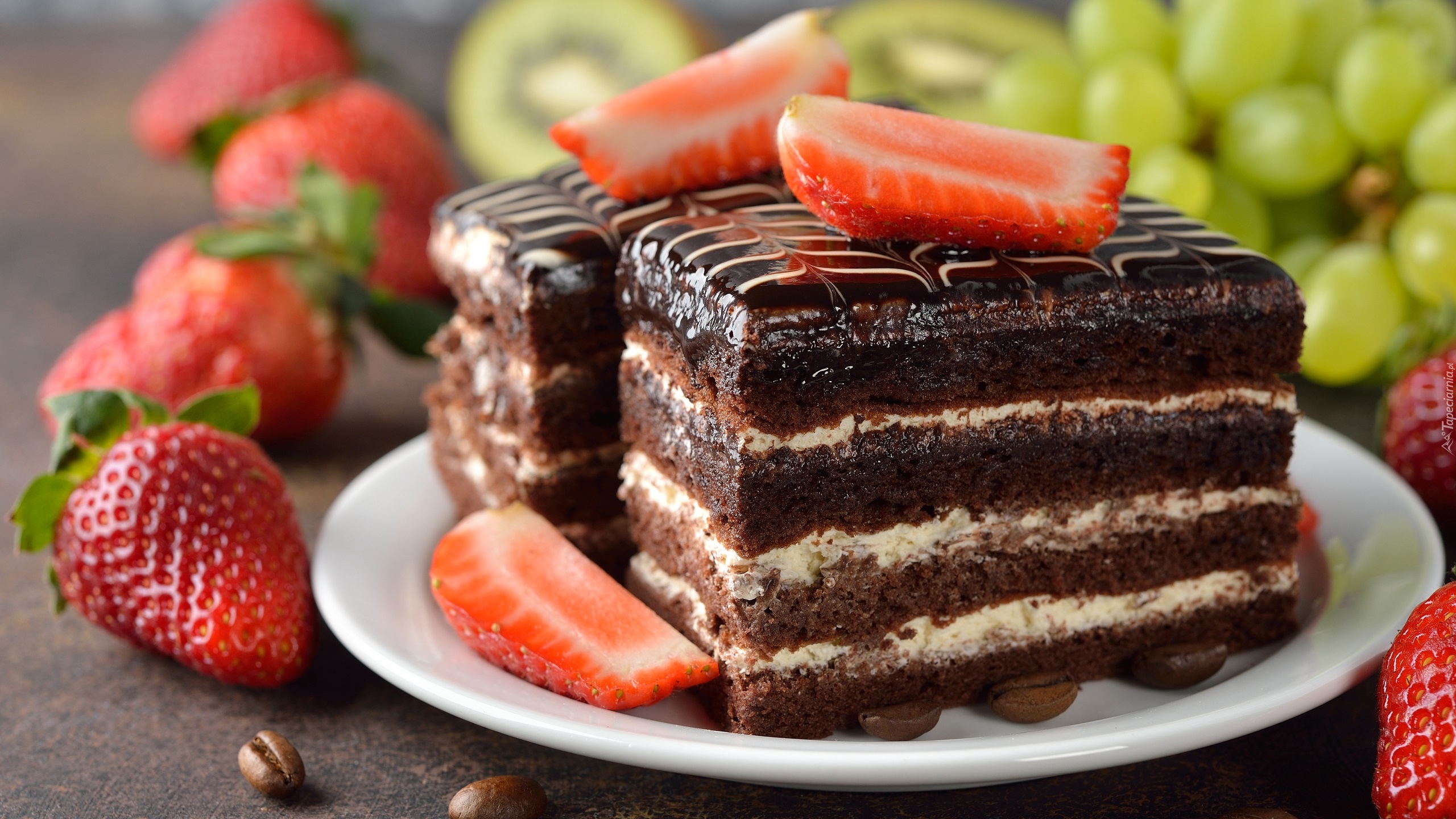 Edytor tapety: Dwa kawałki ciasta w czekoladzie z truskawkami