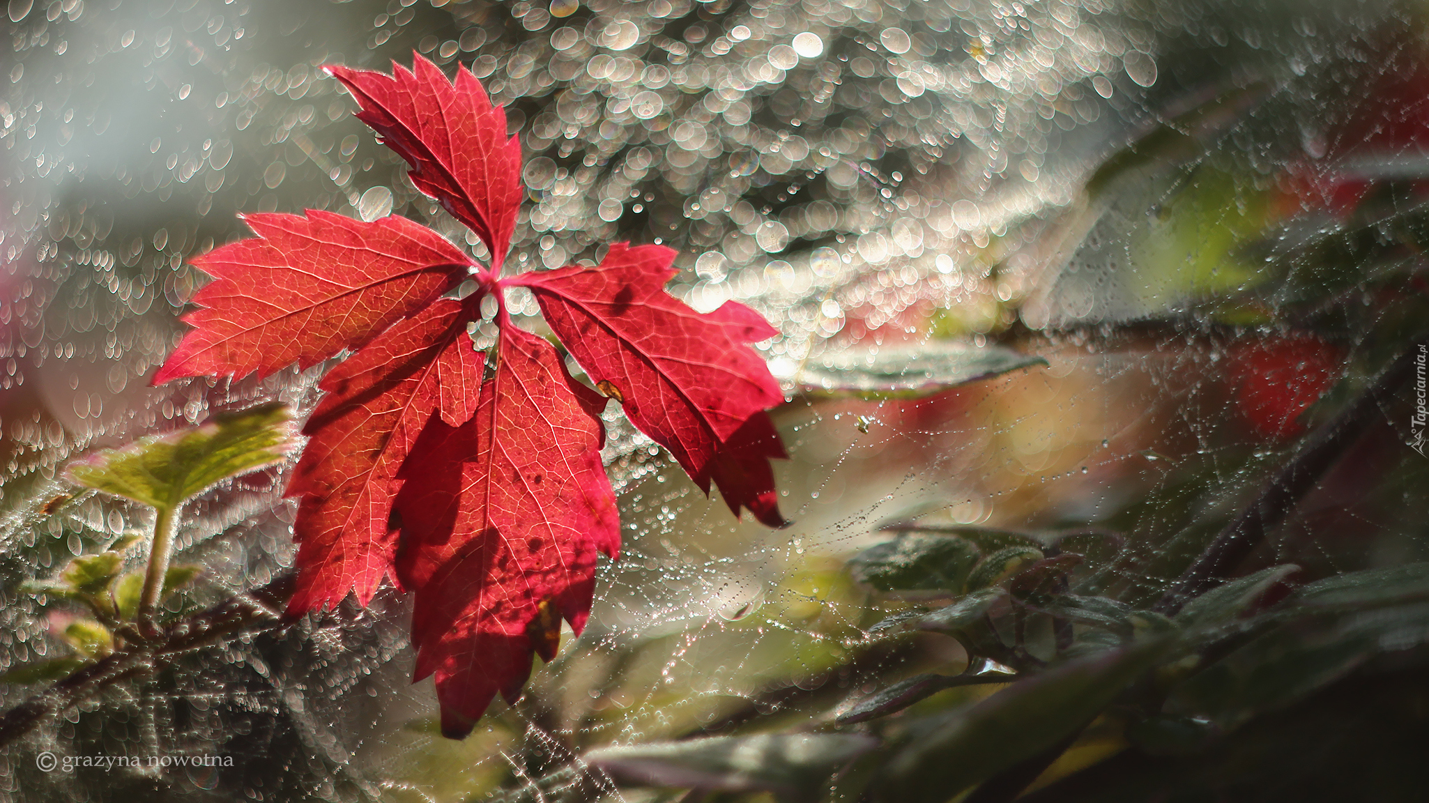 Edytor tapety: Czerwony liść nad pajęczyną w bokeh