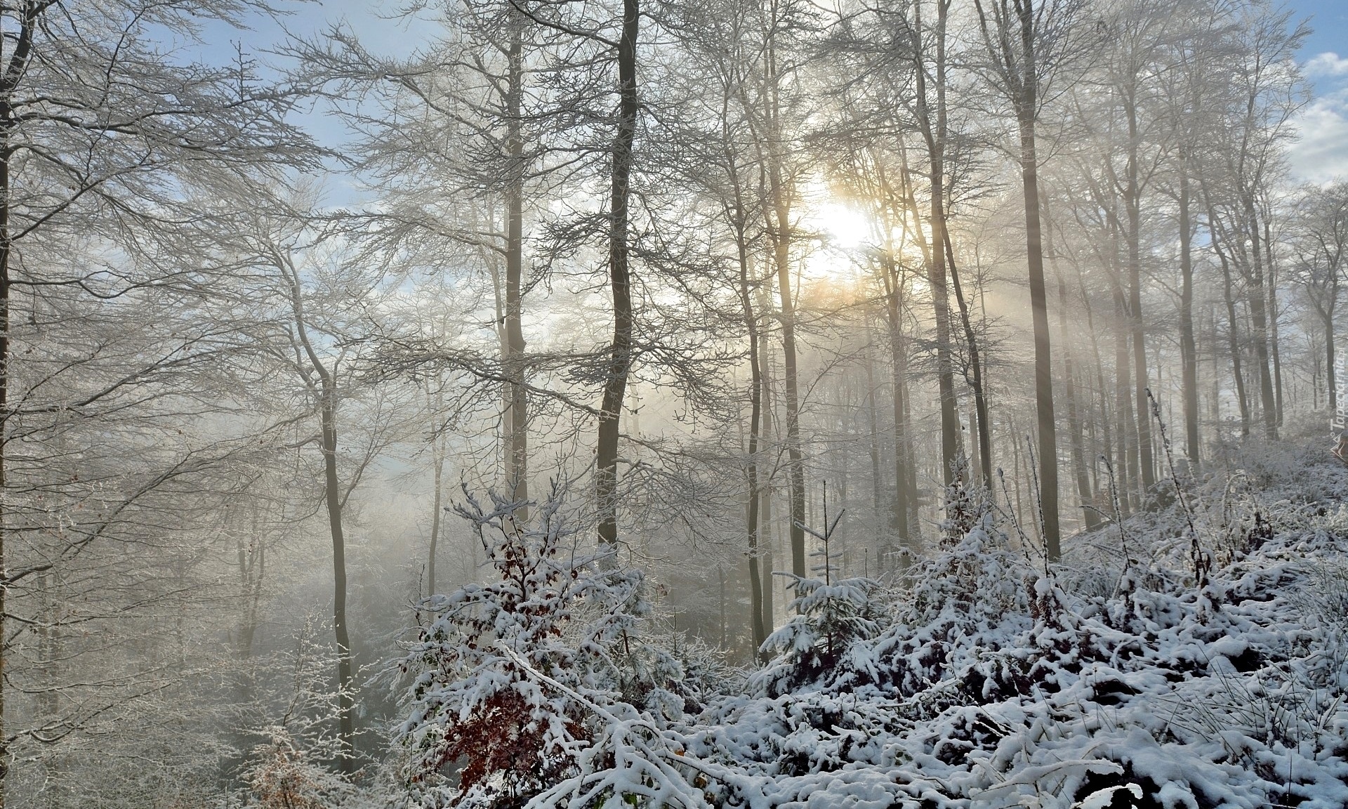 Edytor tapety: Promienie słońca w mglistym lesie zimą