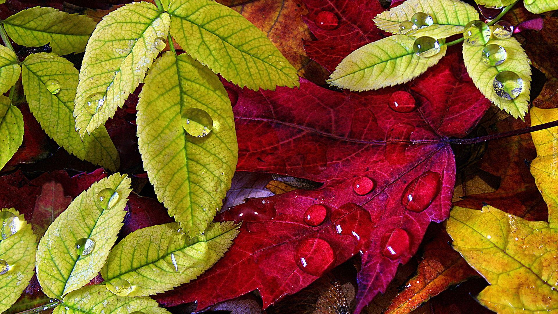 Edytor tapety: Kolorowe jesienne liście w kroplach