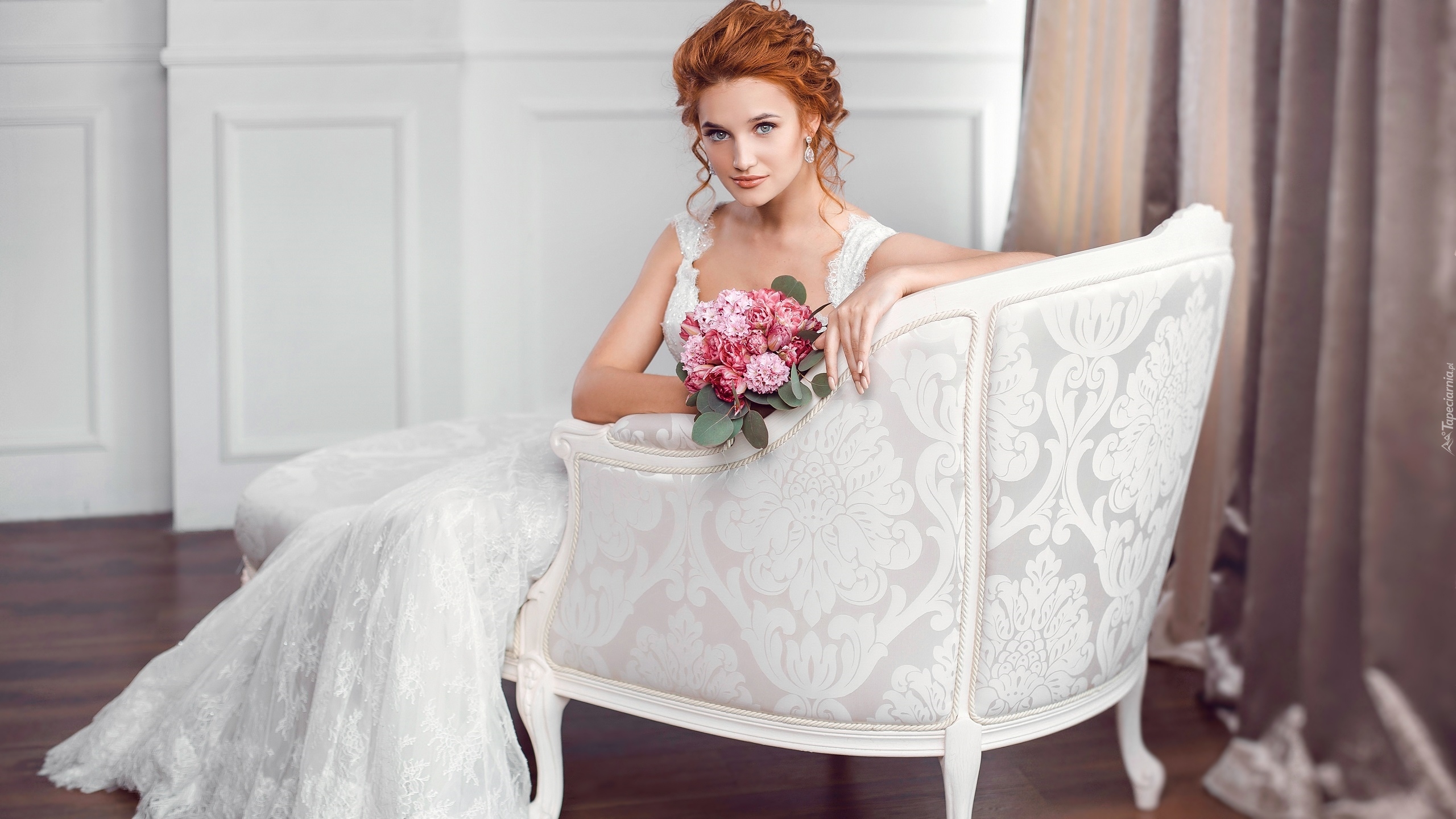 Edytor tapety: Panna młoda z bukietem kwiatów siedzi na fotelu