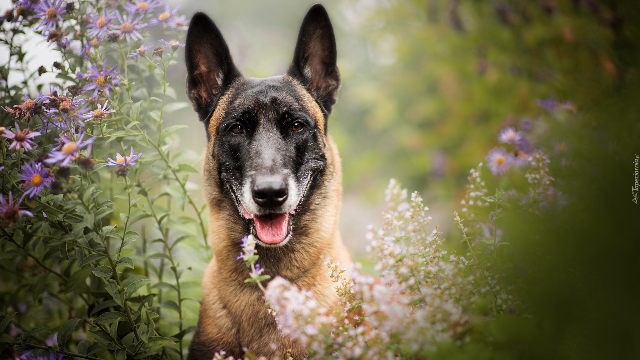 Edytor tapety: Owczarek belgijski malinois w kwiatach
