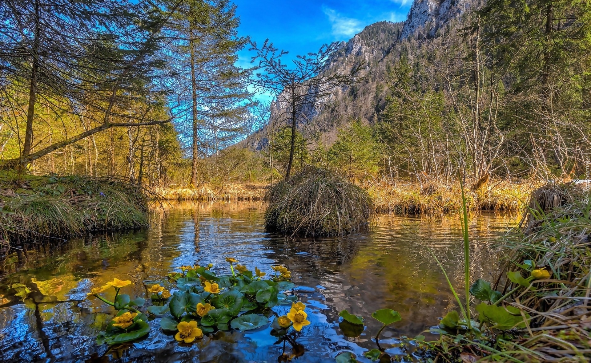 Edytor tapety: Żółte kaczeńce zakwitły w górskiej rzece