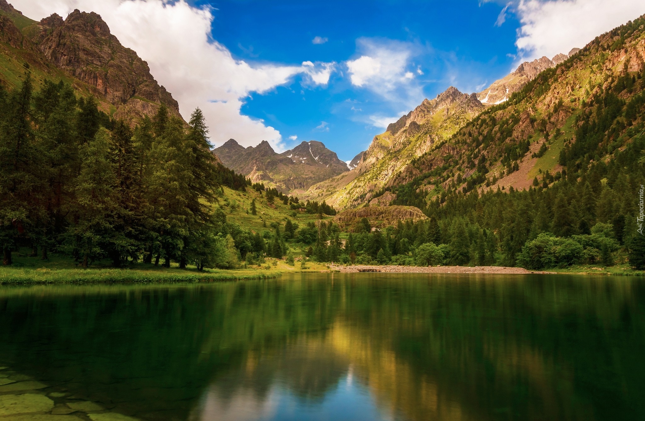 Edytor tapety: Jezioro z widokiem na zalesione góry