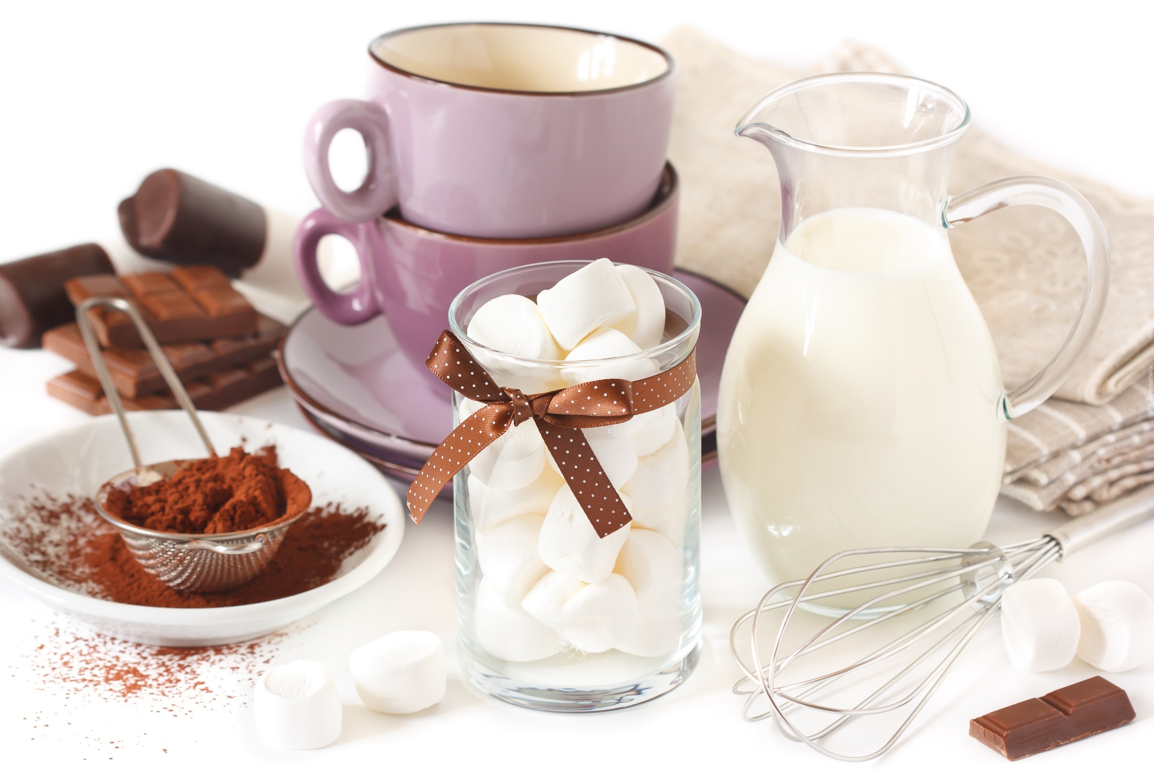 Edytor tapety: Filiżanki obok dzbanka z mlekiem i czekolady