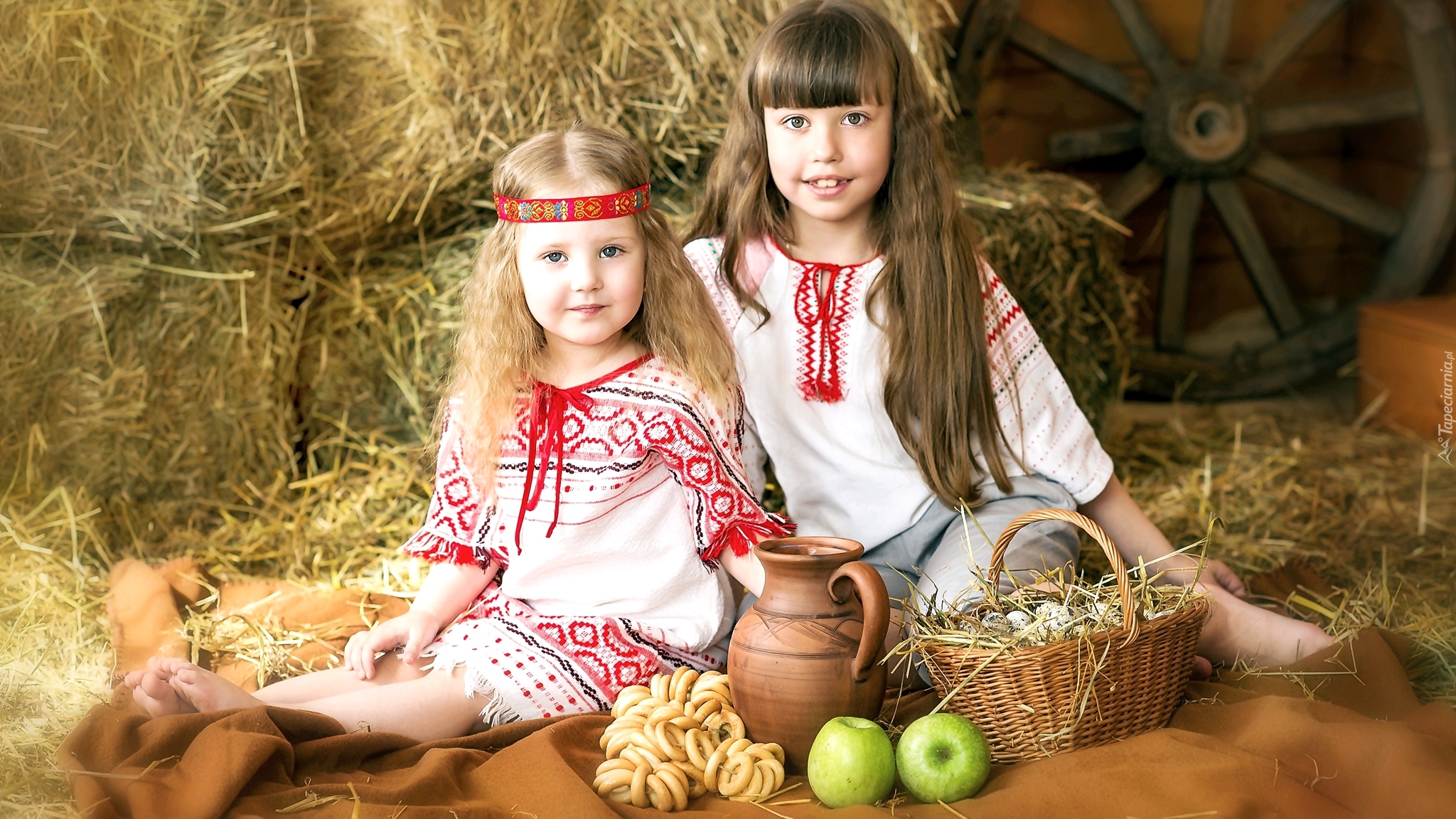 Edytor tapety: Dziewczynki siedzące na kocu w stodole