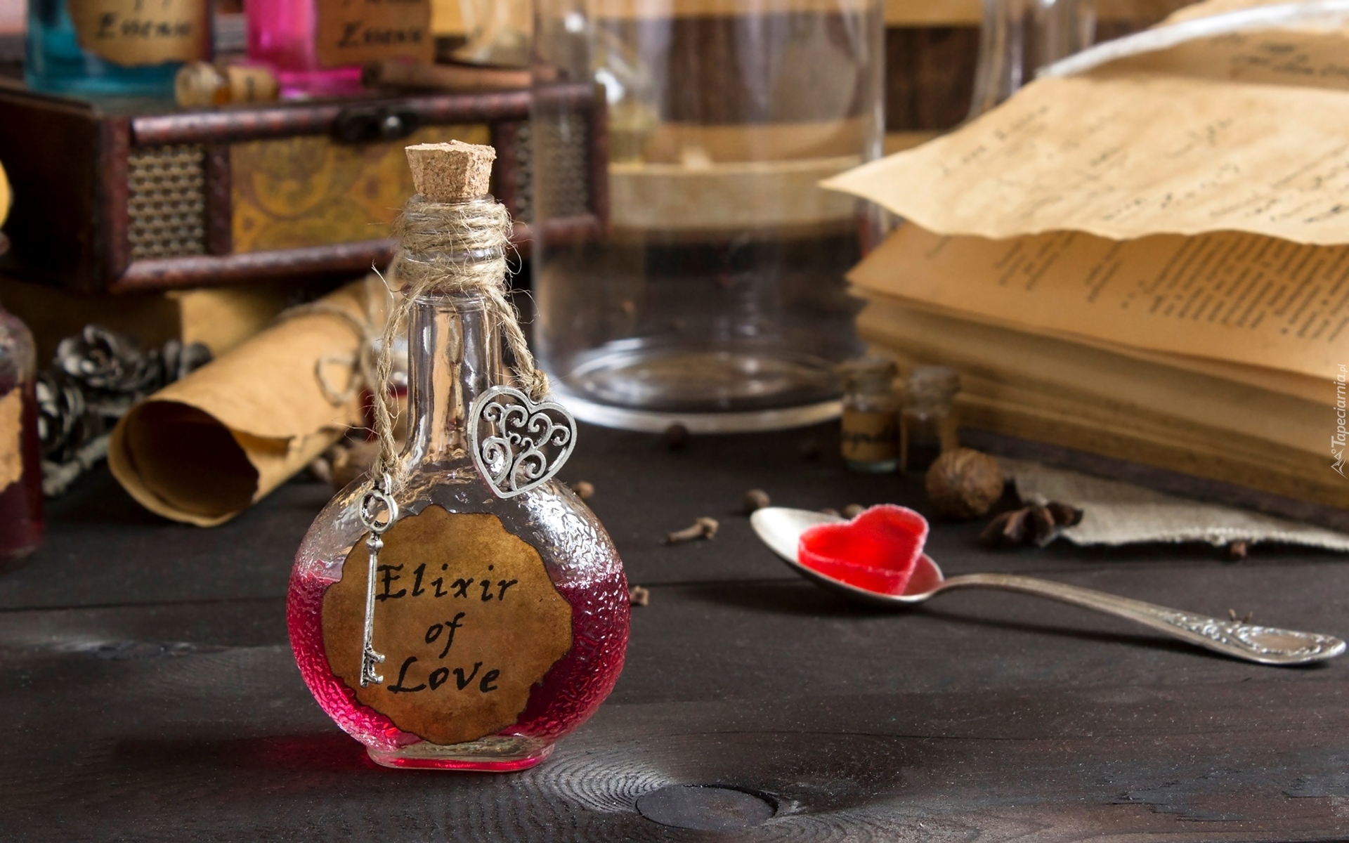 Edytor tapety: Eliksir miłości w buteleczce obok serca na łyżeczce