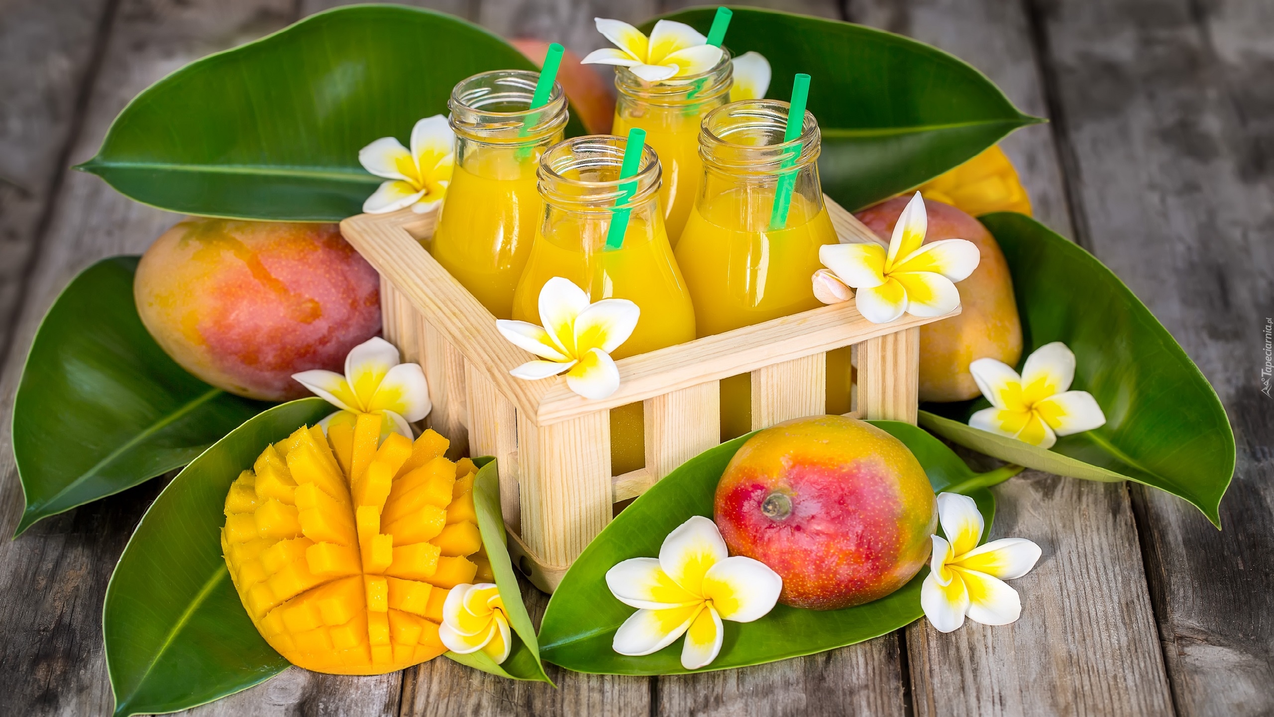 Edytor tapety: Owoce mango obok skrzynki z butelkami napełnionymi sokiem