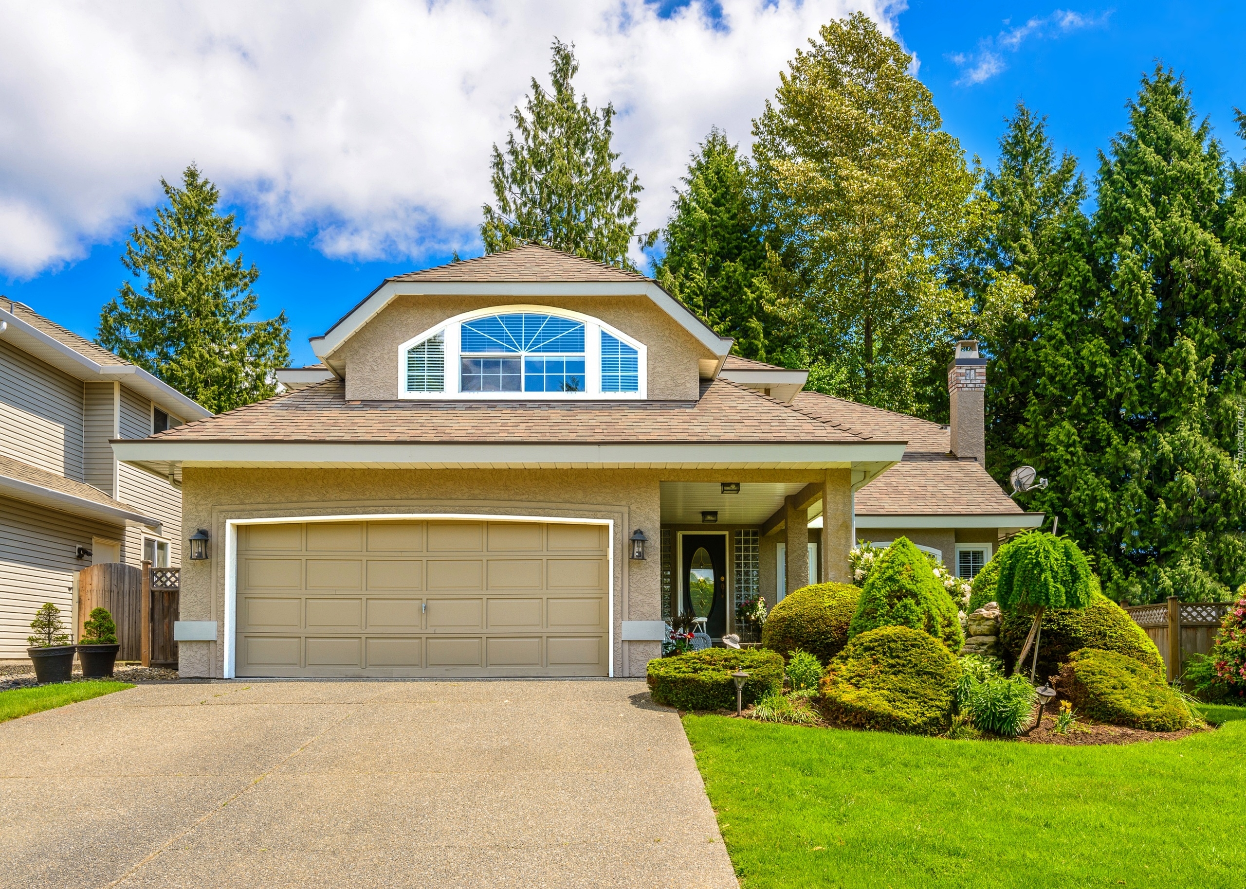Edytor tapety: Dom z garażem otoczony roślinnością