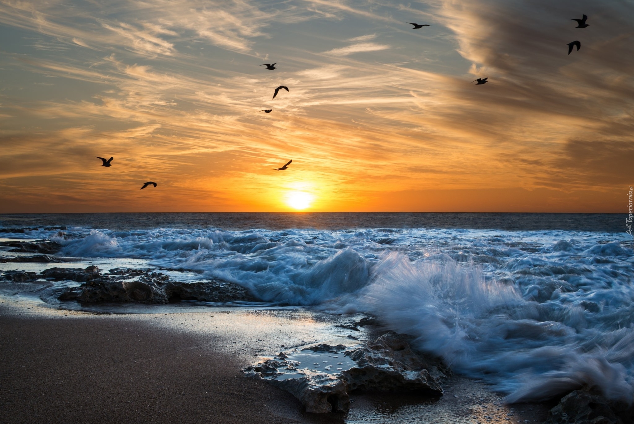 Edytor tapety: Ptaki nad morzem o wschodzie słońca