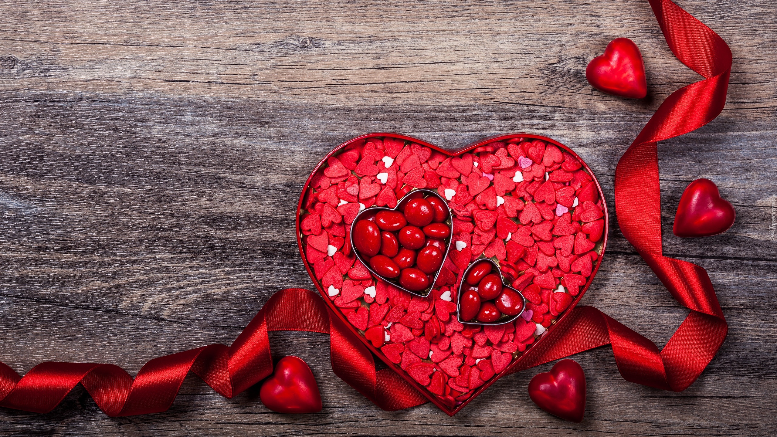 Edytor tapety: Czerwone serca i wstążka na deskach